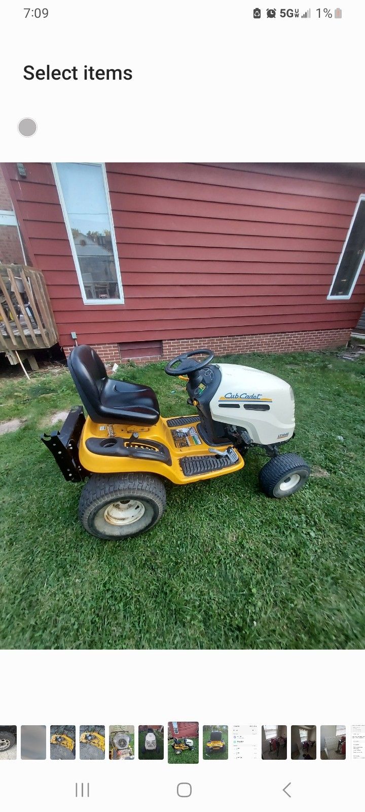 Cub cadet riding mower. mower deck is off because I had to replace transmission belt... you will need to clean carburetor or get new one. It was running fine, but now I can't get it to start. don't have time to fix 350 obo