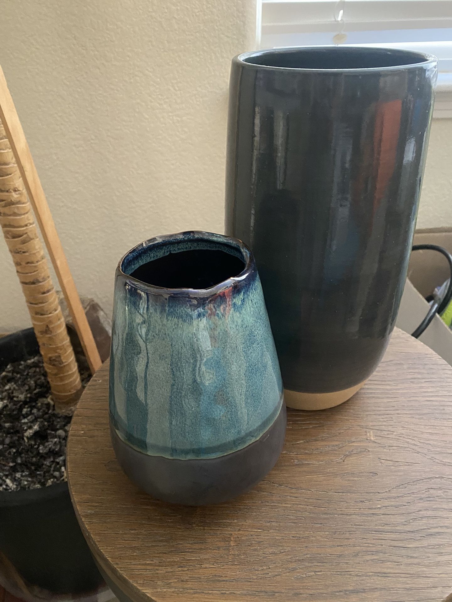 Two ceramic vases or containers for flowers or kitchen utensils. One about 8 “ tall and one about 12” tall.