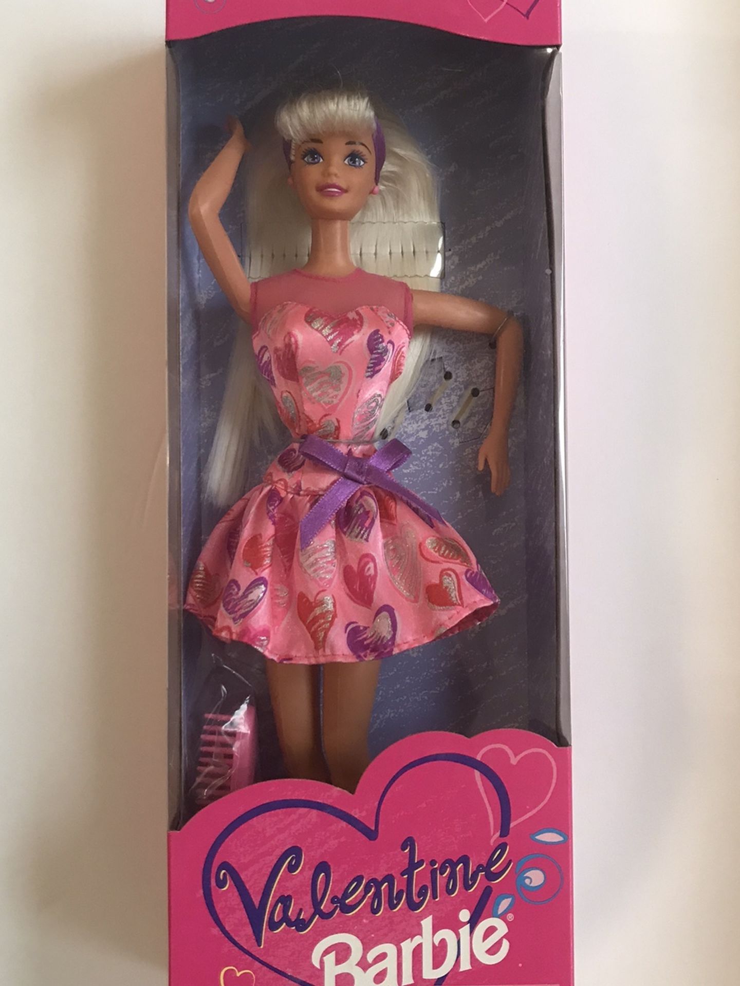 1997 Valentine Barbie Special Edition Pink dress with hearts. Box, doll and outfit are all in excellent condition. Never removed from the box. Barbie's plastic candy Box is loose in box. Comes with a hairbrush. Smoke free home