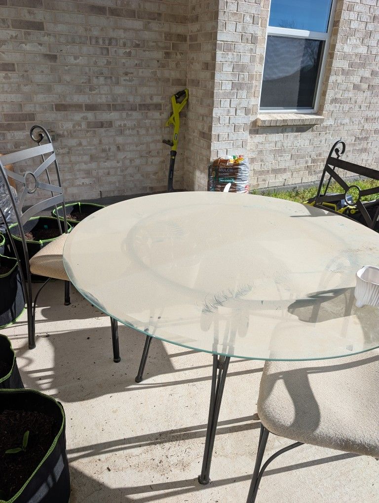 Glass top lawn table with 3 chairs. The structure is metal.Must pick it up. All together for $10