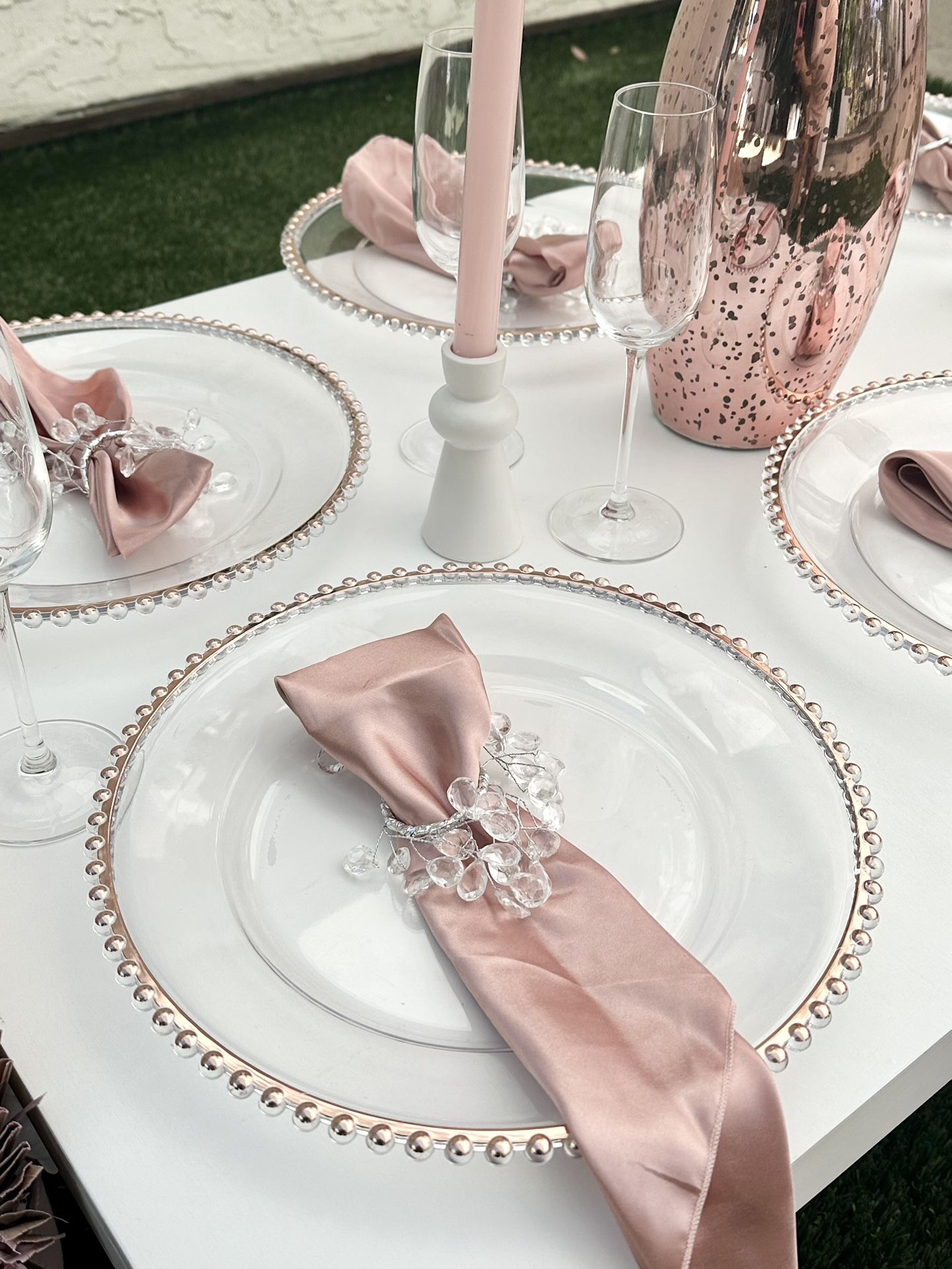 Follow our Instagram page & Ask for date availability White charger plates $1 each Clear & rose gold Charger plates $1.50 each Goblets $2 each Candle holders $2 each Faux floral centerpieces (price varies by size and style) Perfect for table decorations wedding birthday party baby shower graduation engagement gender reveal bridal shower
