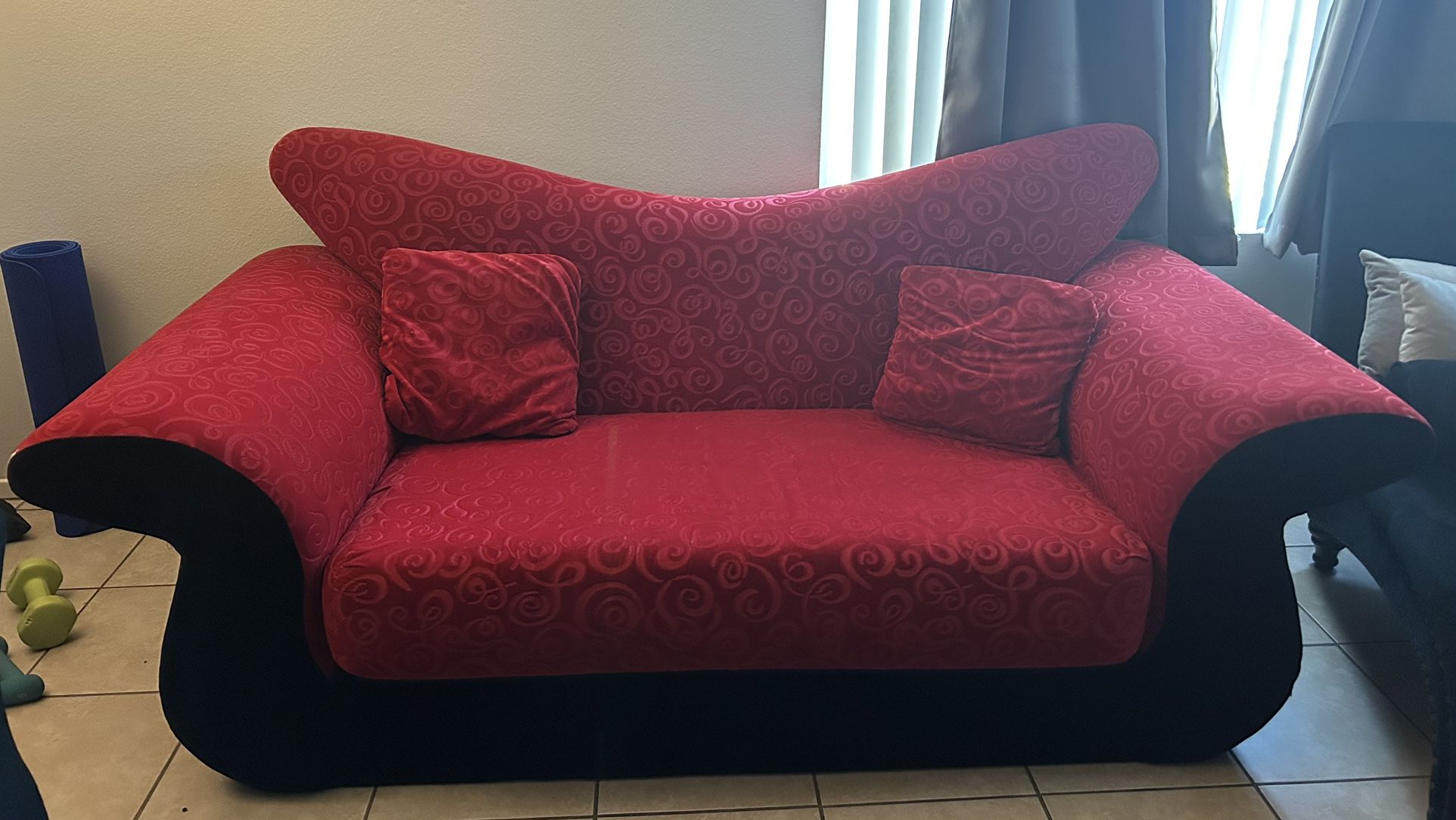 Red & black velvet sofa. Some tears on the arms (see pics), but I would cover with a throw blanket. I had a piece of wood cut for under the sofa cushion to prevent sinking. L - 75; W - 36; H - 36