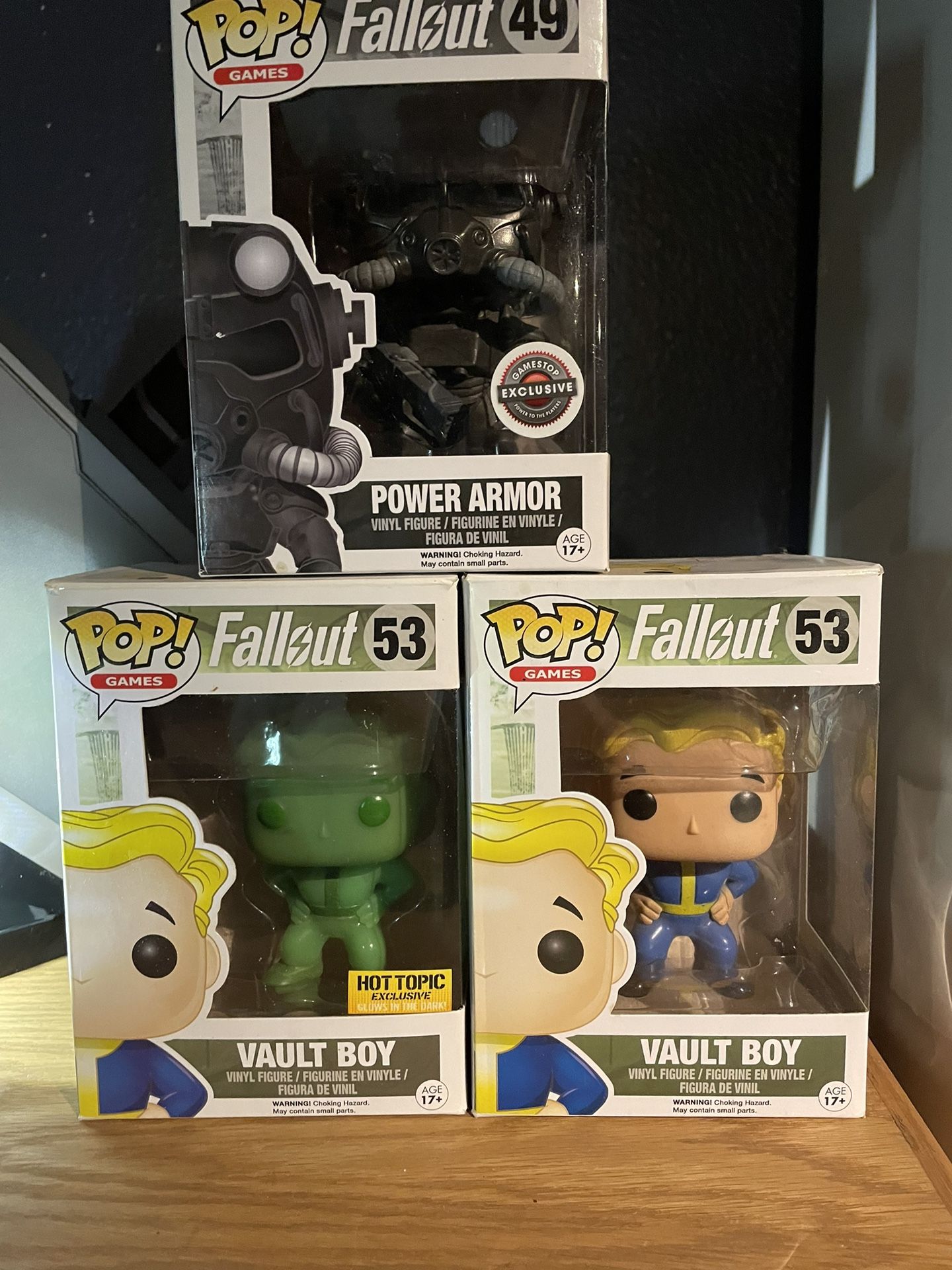 -Power Armor Funko Pop #49 (GameStop Exclusive) -Vault Boy Glow in the Dark Funk Pop #53 (Hot Topic Exclusive) -Vault Boy Funko Pop #53 All from video game Fallout series