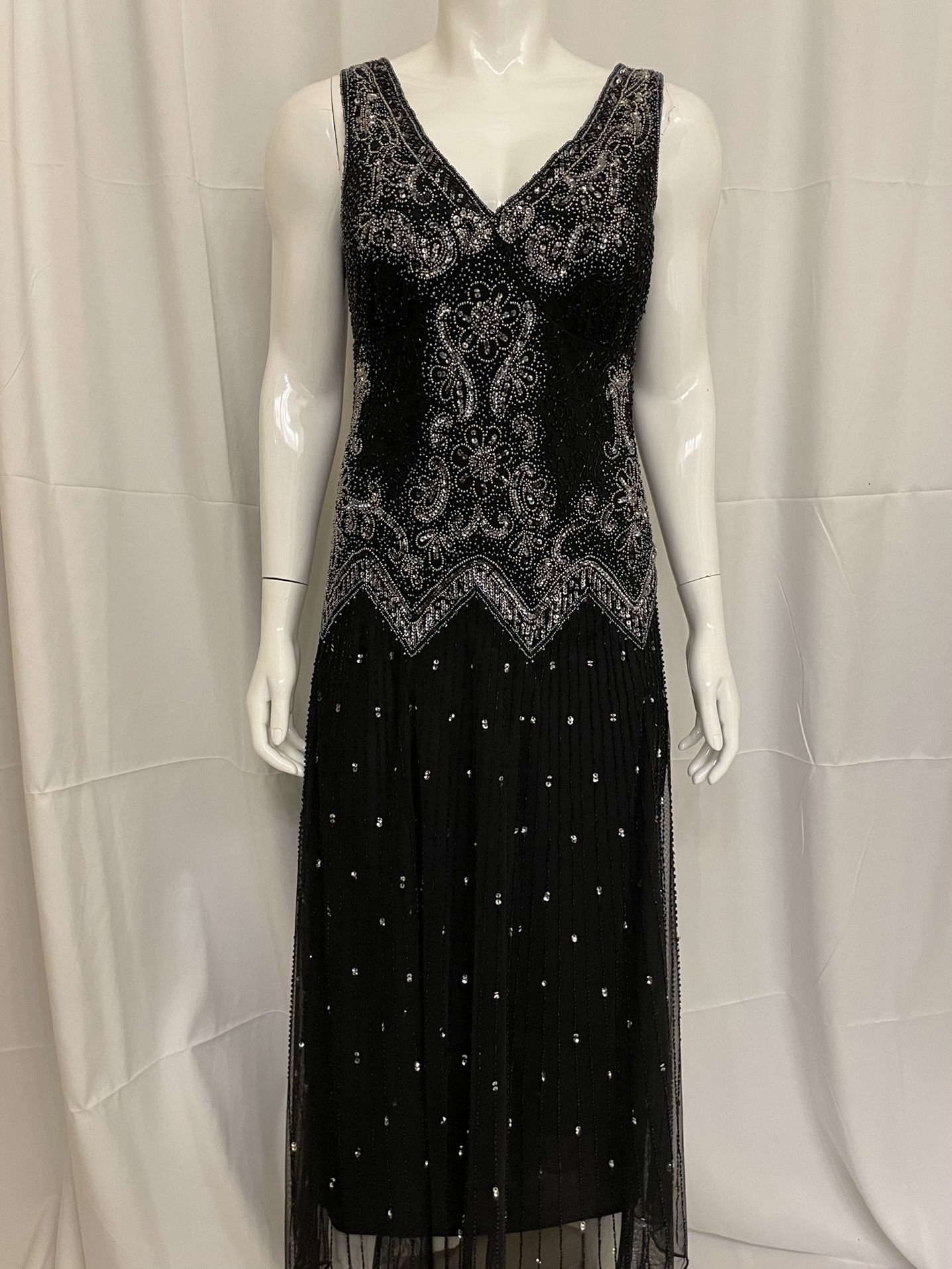 Black sleeveless dress with black and silver beads and sequins. Formal floor length. Fully lined. Side zipper. Worn once. Roaring’20’s/ Great Gatsby style. Wedding, cruise, quinceanera, gala, theme party. Location near Greenway Road and 40th Street Phoenix Arizona.