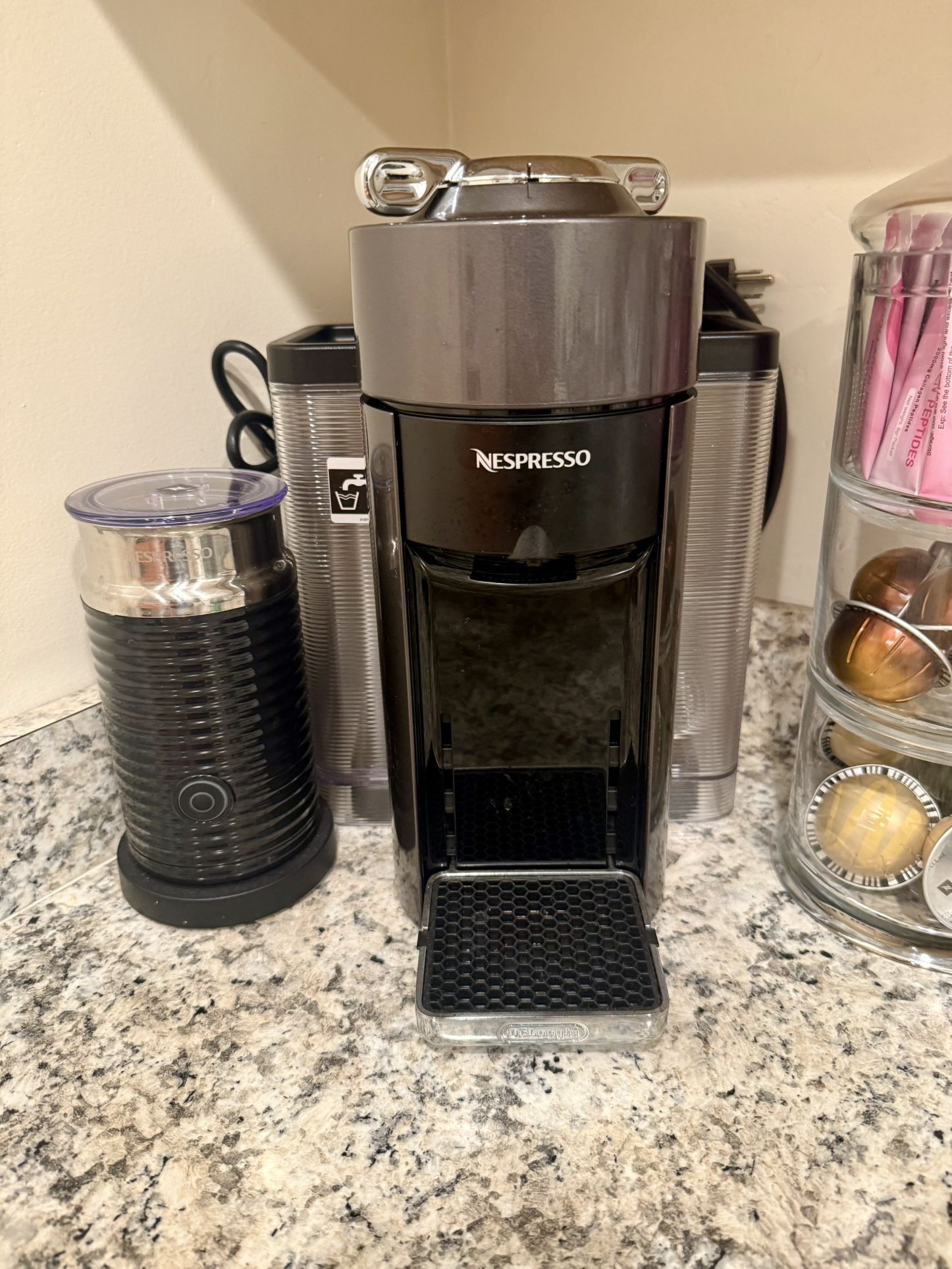 Nespresso Espresso & coffee machine + Nespresso Aeroccino (milk frother) Had it for 2 years very gently & rarely used it’s pretty much just counter decoration atp … I quit drinking coffee & need it gone ! Pods are included! I ordered them in December 2025 for family when they visited & no one used them.