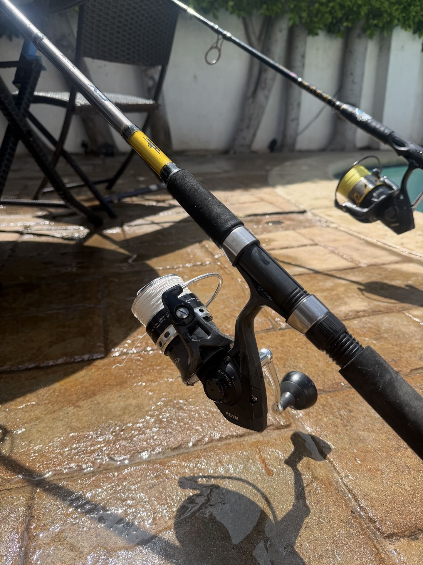 Pursuit IV spooled with fresh 50 Pound Beyond Braid and a Shimano FX 8 Foot Medium Heavy (Broken Tip) Very good rod for halibut and bass especially from piers or jetties. The reel is in good condition and has been washed after every use but is missing the handle screw