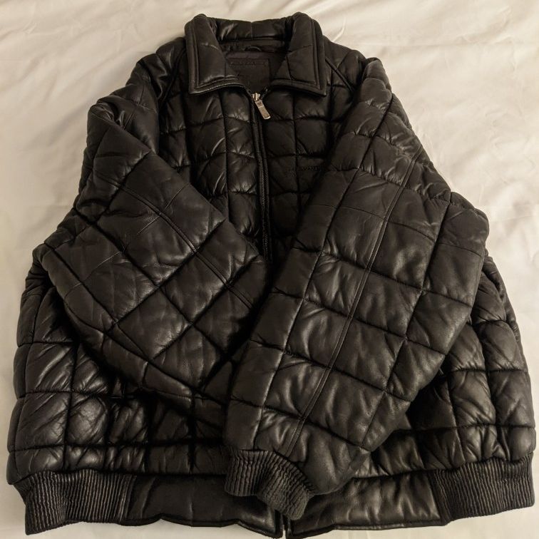 Selling my triple fast goose down black leather jacket in like new condition bought this as in impulse wanted it so bad got the only size left was a 6X after wearing 2 times it's just too big this is a official told fast old school heavy house down leather you can wear this with at shirt and still be hot the leather is super soft very well made crushed sleeve cuffs and waistband immaculate stitching on like new condition wish I could keep for myself but I can't fit it just sitting in closet in plastic wrap