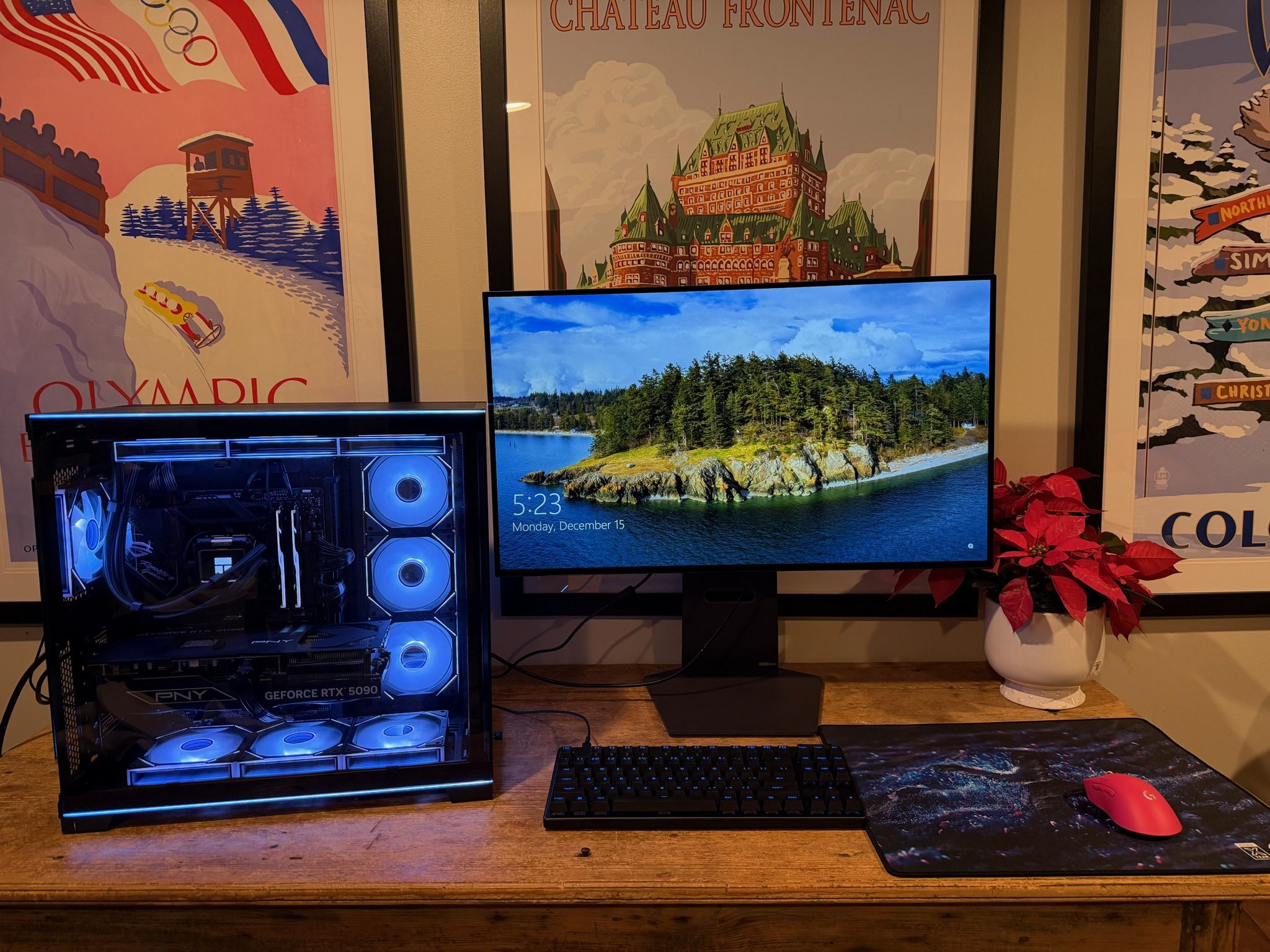 1300w platinum power supply. 1 TB ssd. Lian li O11 Dynamic. 32gb X 2 sticks of DDR5-6400 ram. 480 hz OLED 4k monitor. Logitech gaming keyboard and mouse. WiFi and Bluetooth. Water cooled.