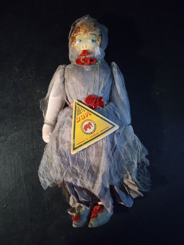 Antique French doll with original tag. Fragile. Doll is 11" and fragile. This is perfect for collectors who want to preserve historic pieces. Was part of a woman's travel collection.