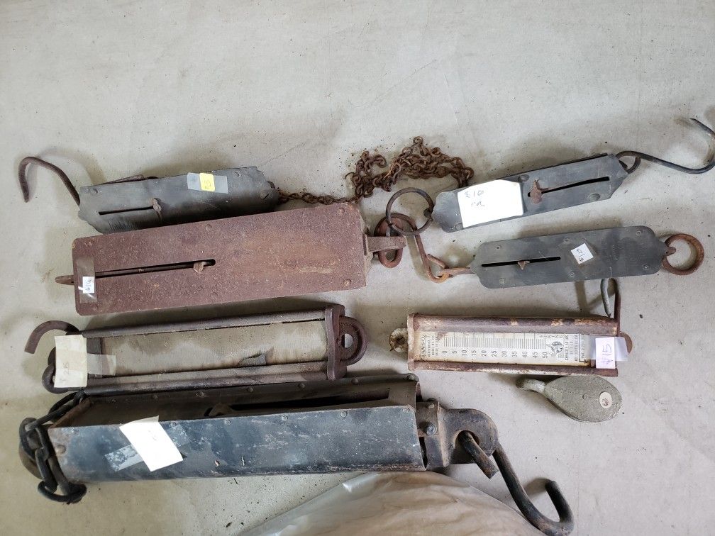 A variety of hanging vintage scales Priced separately at $10- $25 each.