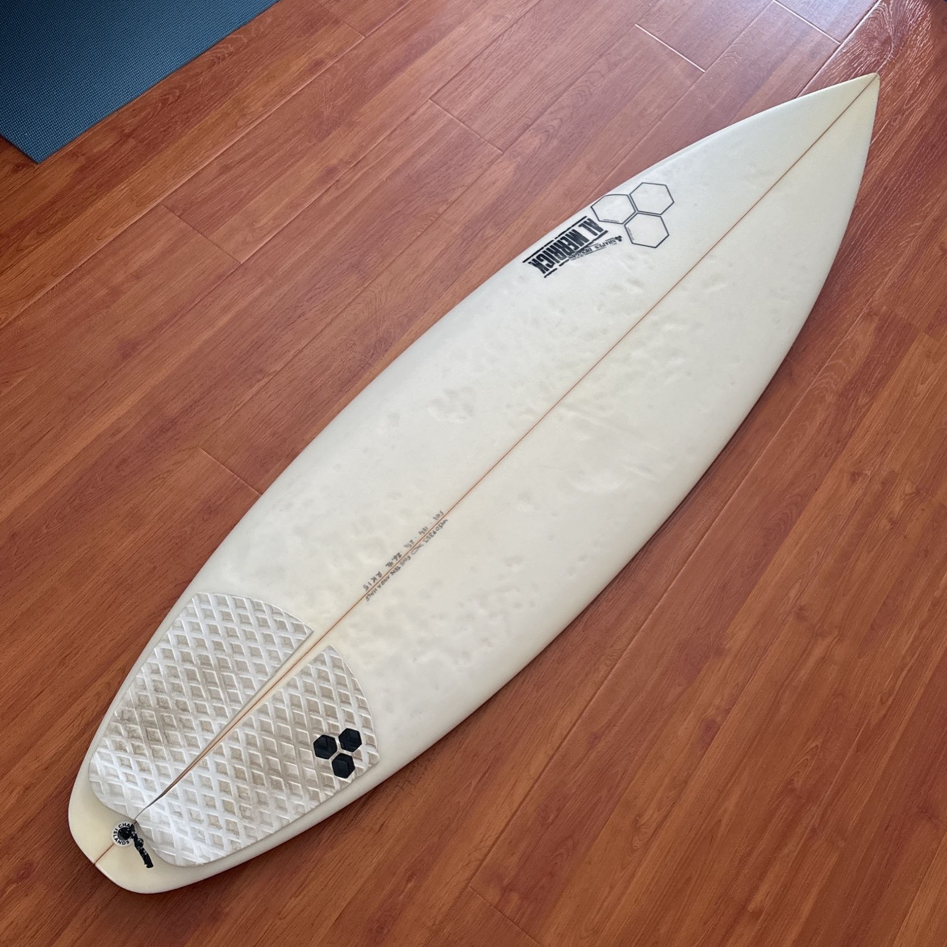 Brand: Channel Islands Model: Rook15 Size: 5’10.5” Dimensions: I can’t read Volume: 26.4cl 5 fins set up FCSII Condition: good A couple repairs nothing major Water tight
