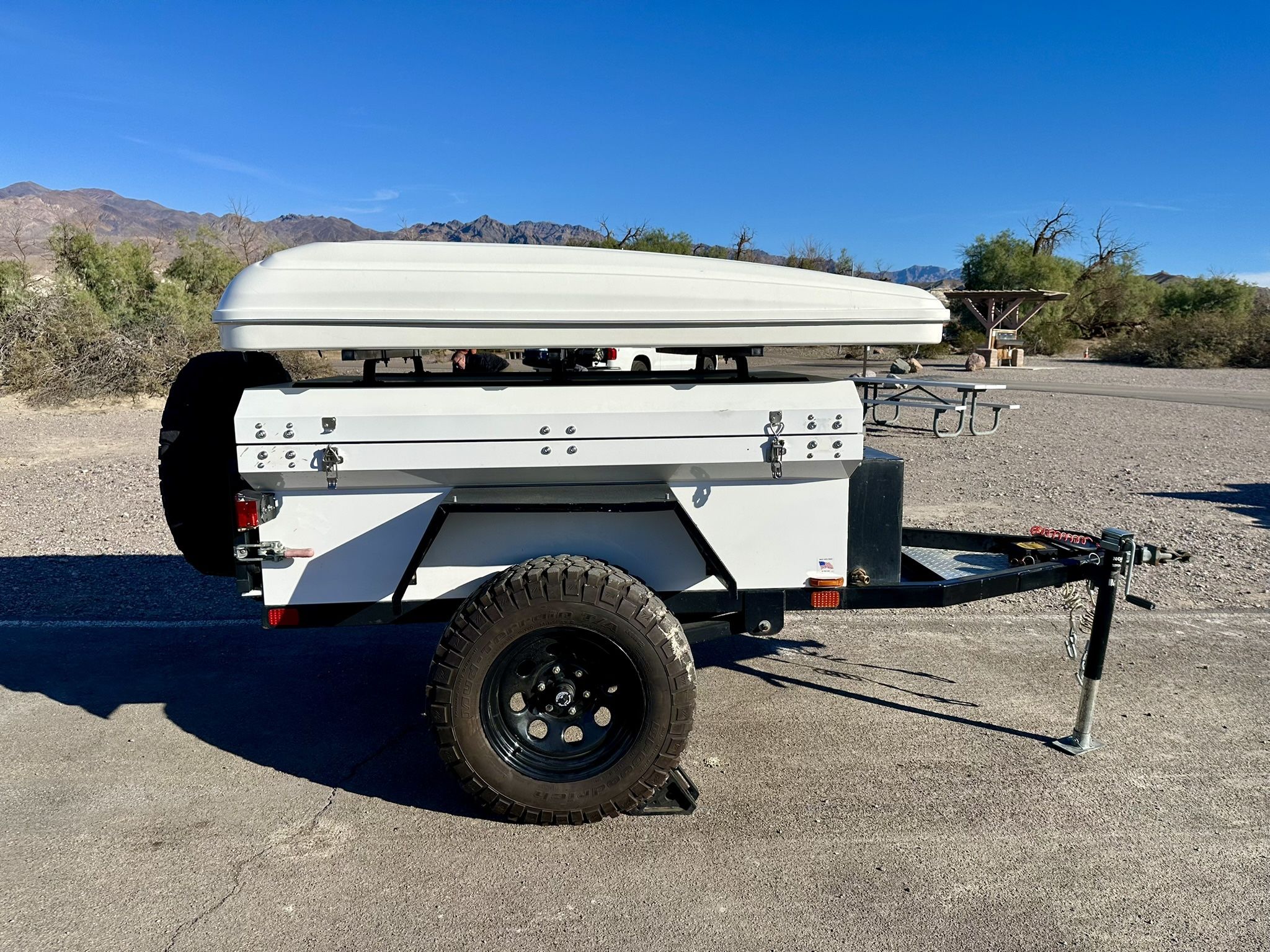 AT Overland Adventure Trailer Chaser with rooftop tent. Built like a tank! Great for rock crawling rig or light off-road boon docking. Trailer comes with the following: Autohome Airtop RTT with Full/Double size mattress 19 gallon water tank On-board battery and 12V system Engel 40qt 12v fridge 11lbs propane tank and mount On-board Viair 12v compressor 2.5 gallon Viair air tank BF Goodrich 255/75R17 Mud Terrains 6x5.5 bolt pattern wheels (Fits Tacoma pattern) Lock N Roll hitch Electric trailer brakes Airbag suspension Weighs 1,500 lbs with the water tank full Have title in hand