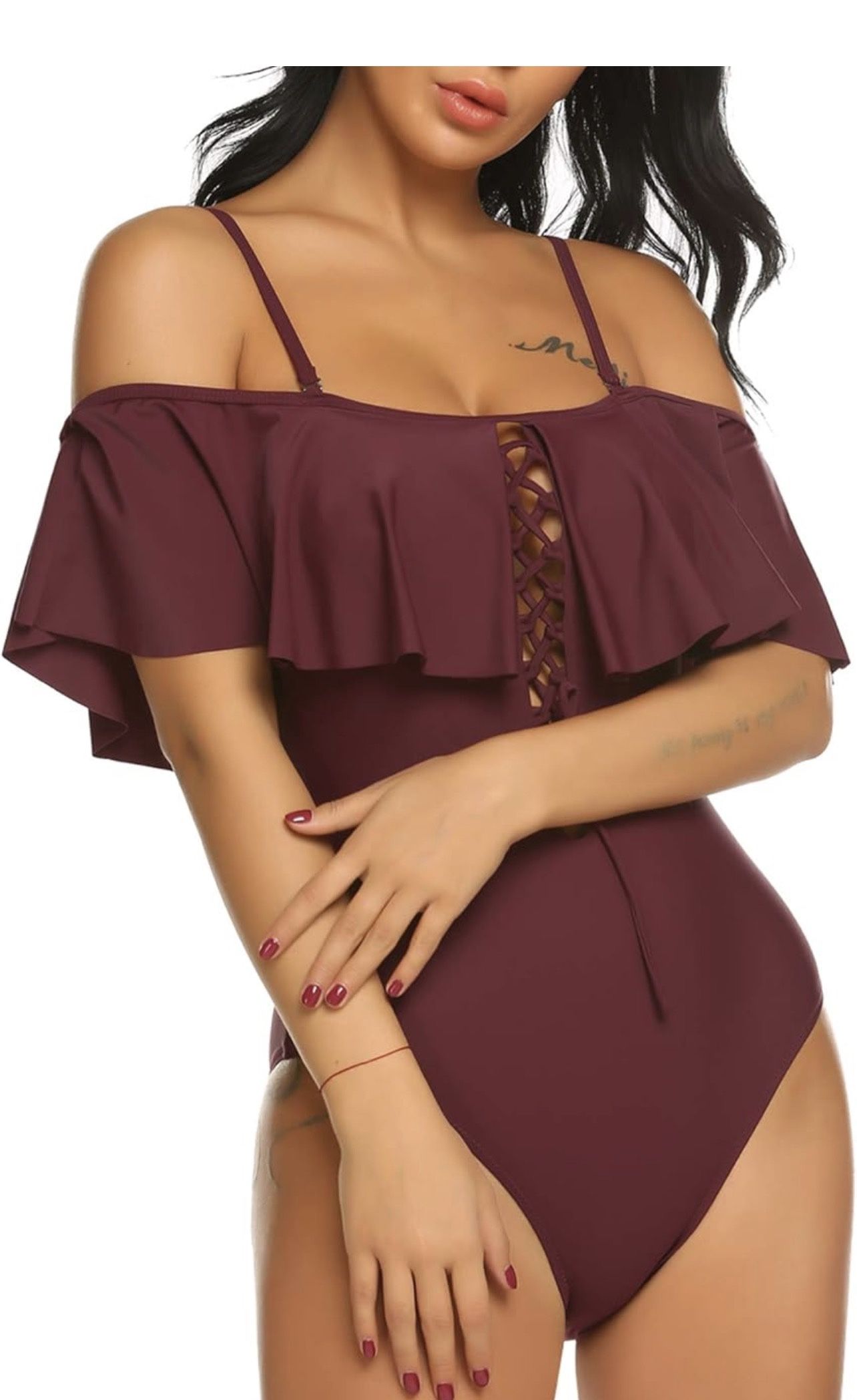 Women One Piece Swimsuits Off Shoulder Flounce Ruffled Swimwear Bathing Suits( Red,M)