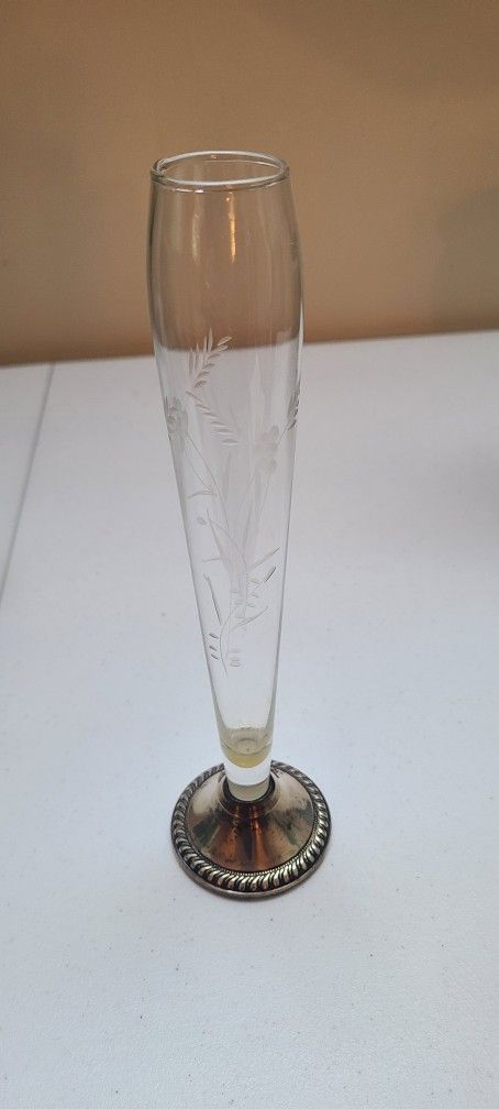 Decorative etched glass bud vase with sterling silver base. 9.5 inches tall.