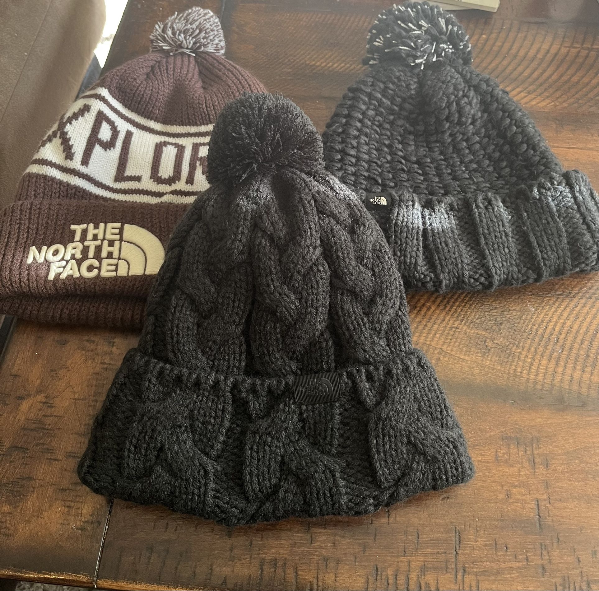 Maroon has never been worn, Black on black worn once and the black and white worn a few times. Both black beanies are women’s and the maroon is a unisex.