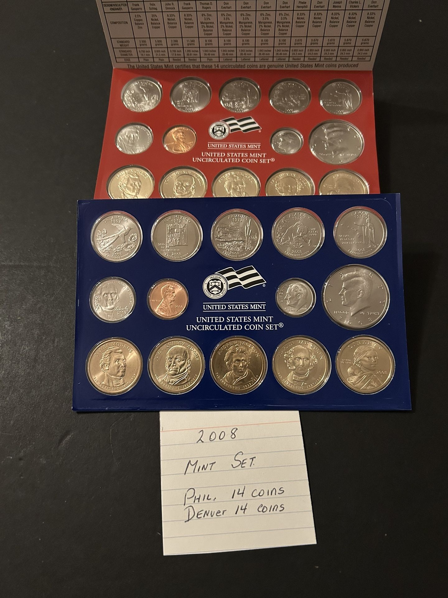2008 Mint Set in original mint packaging - 14 Denver coins and 14 Philadelphia coins - mintage 745,464 sets - contains 2 Lincoln pennies, 2 Jefferson nickels, 2 Roosevelt dimes, 2 Kennedy half dollars, 10 state quarters and 10 $1 dollar coins – total 28 coins for $33 - a great birthday gift- about $1.17 per coin - other sets 1995 thru 2014 mint sets available