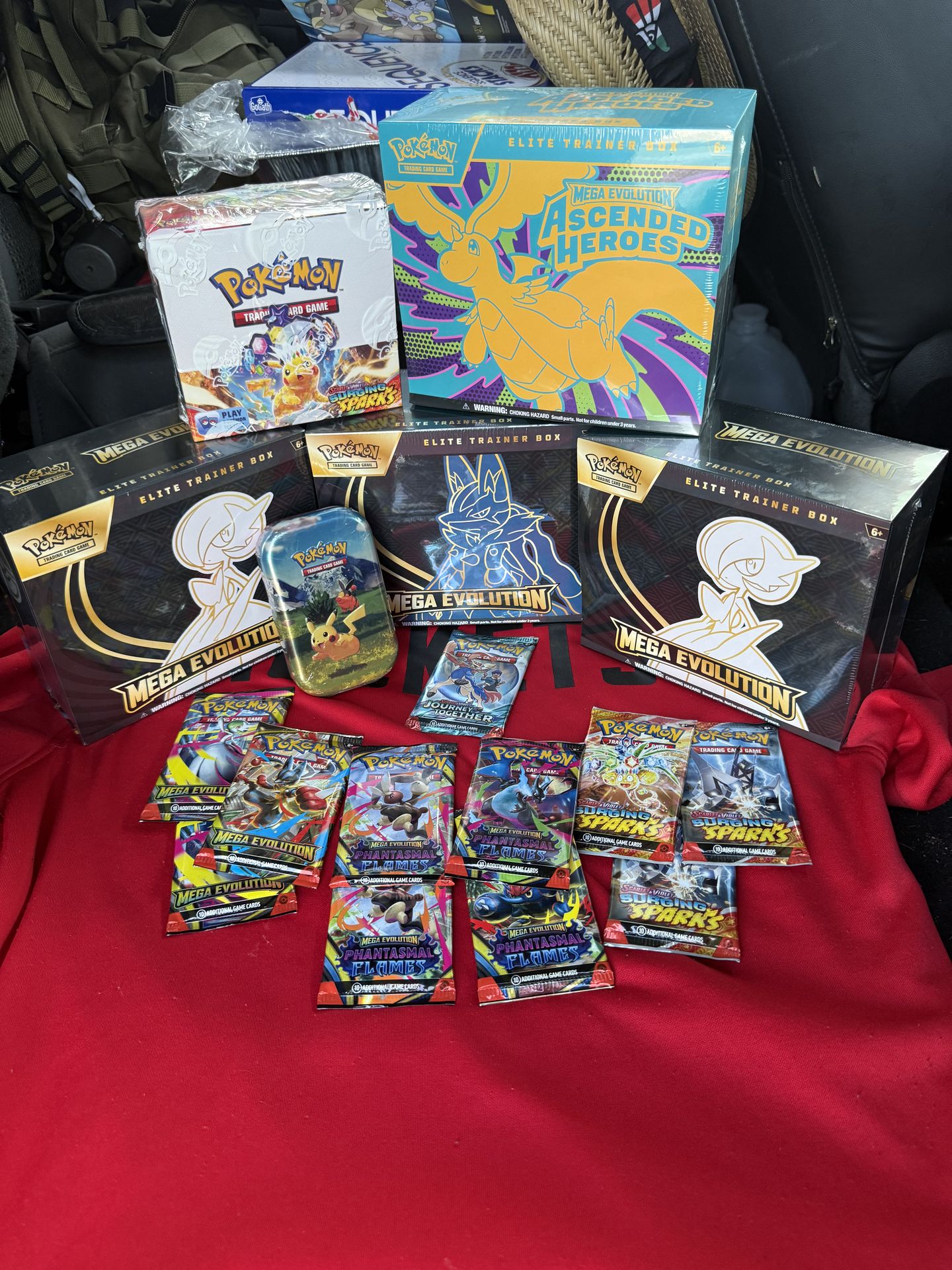 Ascended Heroes ETB Ascended Heroes Mini Tin ( 2 ) Mega Evolution ETB ( 3 ) Surging Sparks Booster Box Mega Evolution Packs ( 3 ) Phantasmal Flames Pack ( 4 ) Surging Sparks Pack ( 3 ) Journey Together Pack ( 1 ) Paradox Clash Tin Mega Evolution Booster Bundle Phantasmal Flames Booster Bundle