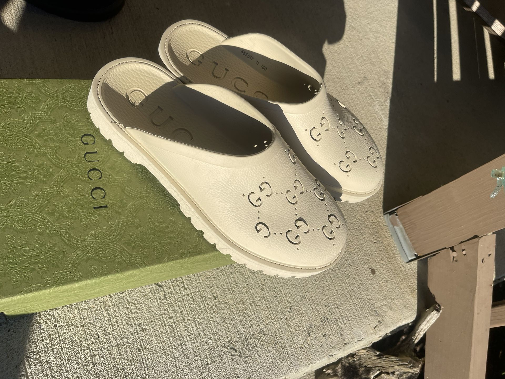 Gucci slides from Nordstrom that I paid $500 for. Going to let them go for 350 because they were only worn once for an important night. They are size 11 and go with ANYTHING. Casual clothes , dress clothes etc.