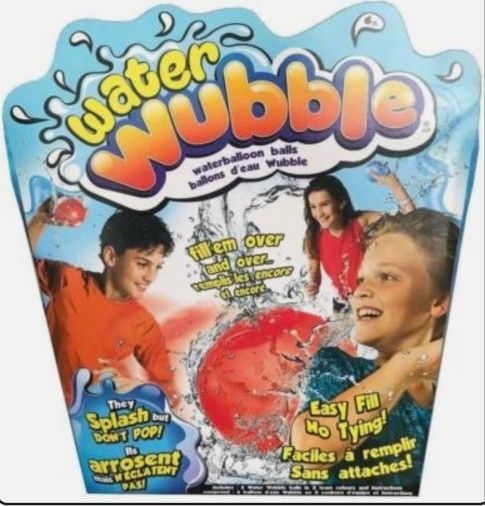 Water Wubble Water balloon Balls are the new best way to have a water balloon fight! All you do is fill with water, push the end of the water balloon inside itself and you have a nice, big, FULL water balloon, that even the kids can refill themselves because they NEVER pop! Water Wubble Water Balloons come in a pack of 6, with 2 colours so you can play on teams! Features: Revolutionary, patent-pending design allows it be filled easily and used over and over One set takes the place of hundreds and hundreds of regular water balloons Easy-fill nozzle allows for filling by just pressing up to the faucet, holding under running water or filling from swimming pools, or any other body of water Reusable, so there is no need to waste time running around your backyard picking up all those broken water balloon pieces Seals itself so no more struggling to fill and tie water balloons