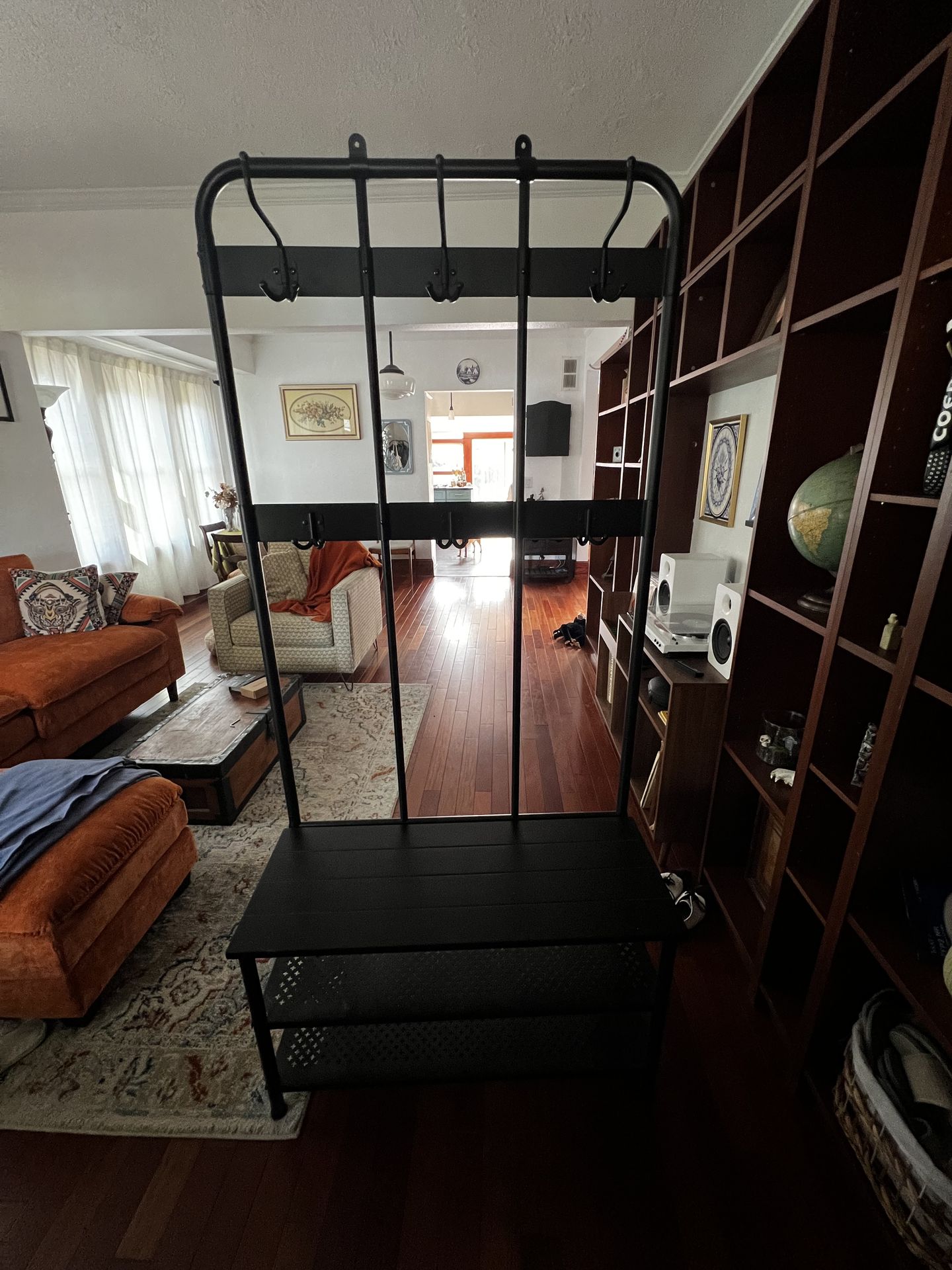 Have had this for one year, moved house and no longer need it. It’s study, there is one hanger the screw is stripped but it still works and holds weight - see picture. Measurements on 4th photo. Original price $99
