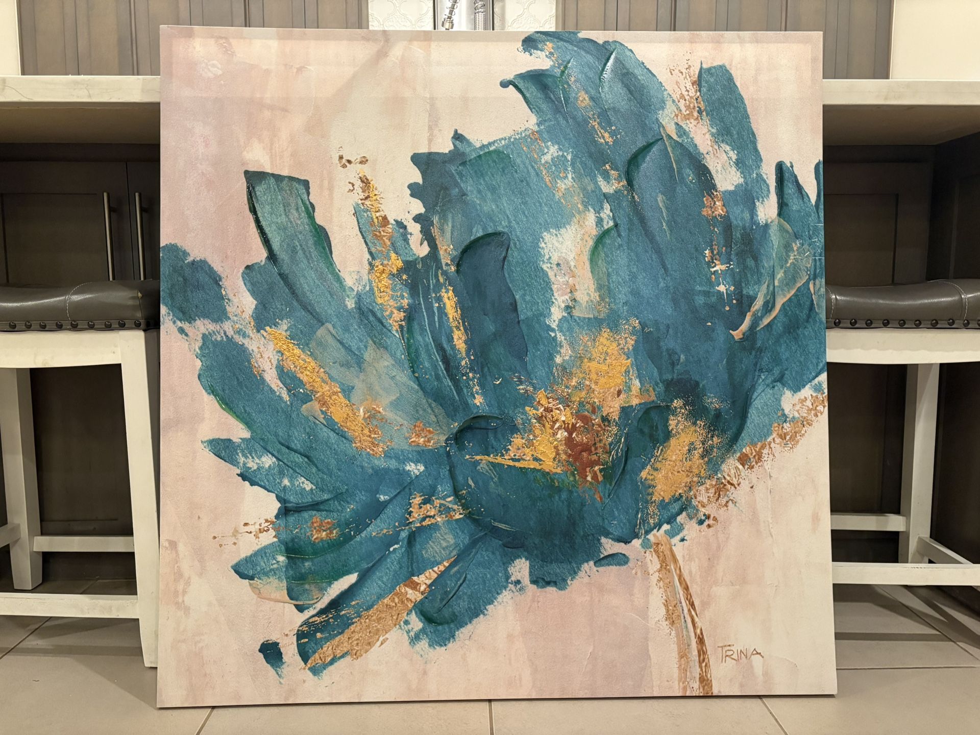 Turquoise and Gold Flower Canvas Wall Art measures 39”x39”. Great condition, and can beautifully adorn any home! Arte para pared color turquesa y oro. Mide 39x39 pulgadas. Buen condition.