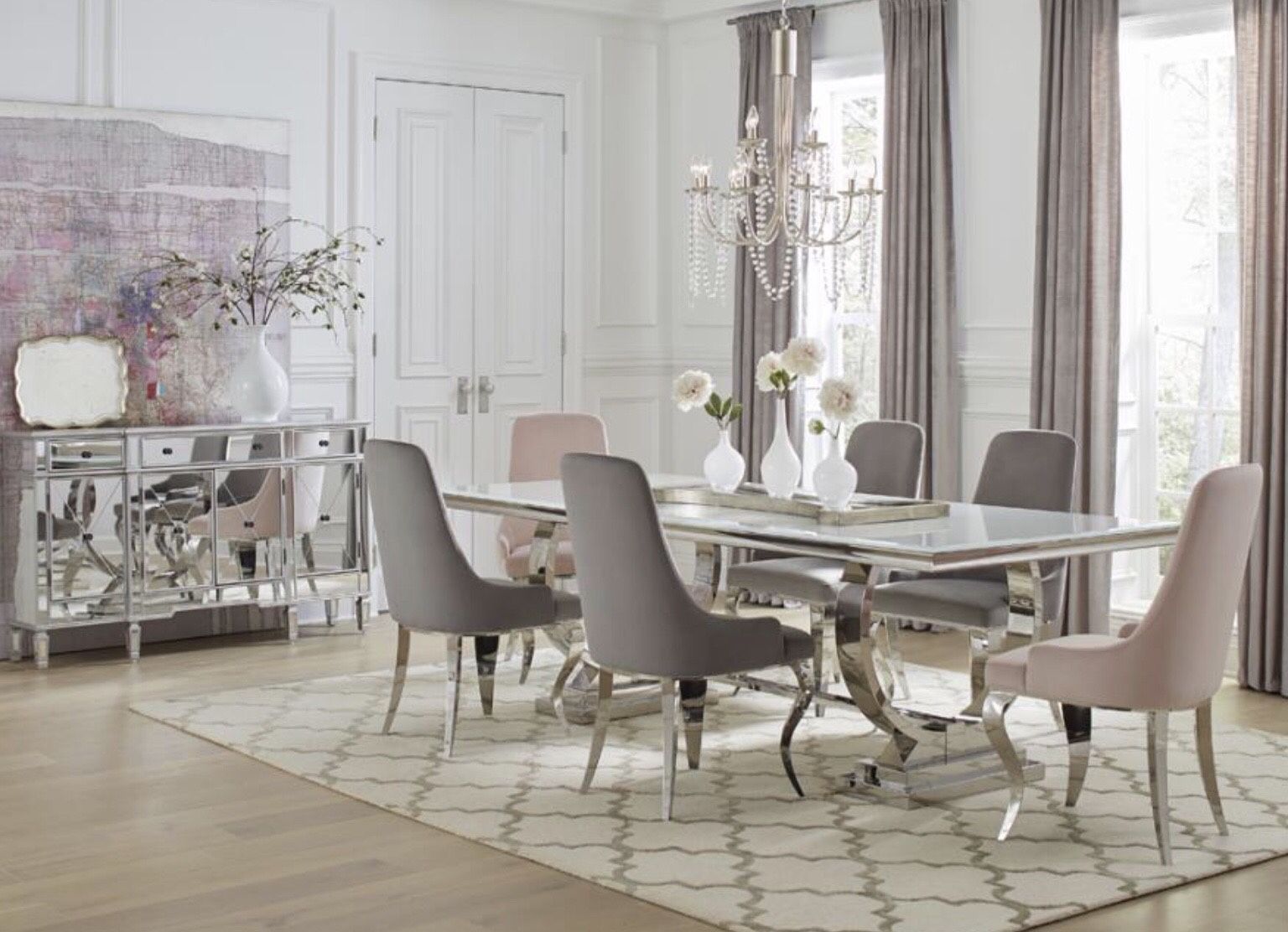 ****HAPPY HOLIDAY SALE**** Brand New 7 Piece Dining Set Only: $2199 Was: $2799 Set Includes: Table & 6 Chairs Server Sold Separately White Glass Table Top Chrome Base Grey or Pink Matte Velvet Chairs Perfect for a soft but elegant look in your dining area Hablamos Español Our Locations Are Open & We Still Offer Delivery or Pick Up Order From The Comfort & Safety of Your Home Or Come Check Out Our Showrooms! Message Us To Order Today! Floor Model’s Up To 50% Off!!!! INCREASE YOUR PURCHASING POWER!!! Easy Approval Credit Check Program w/ 6, 12, 18 & 24 Months Financing No Credit Needed Also Available. SAME AS CASH IF PAID OFF IN 90 DAYS!!! Or Lease To Own $49 Down Come See Us @ One Of Our 2 Locations: Zoe’S Furniture in Richardson, TX. or Dallas, TX. ONLY!!!l CO $108811 CS