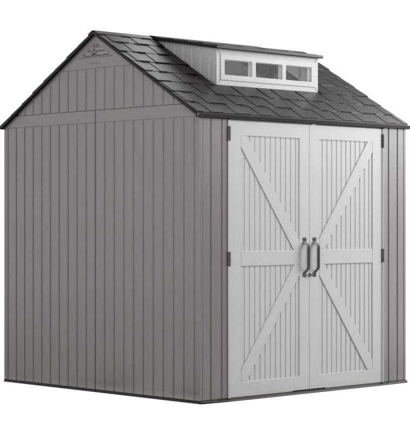 Rubbermaid Resin Weather Resistant Outdoor Storage Shed, 7 x 7 ft., Simple Gray/Onyx, for Garden/Backyard/Home/Pool