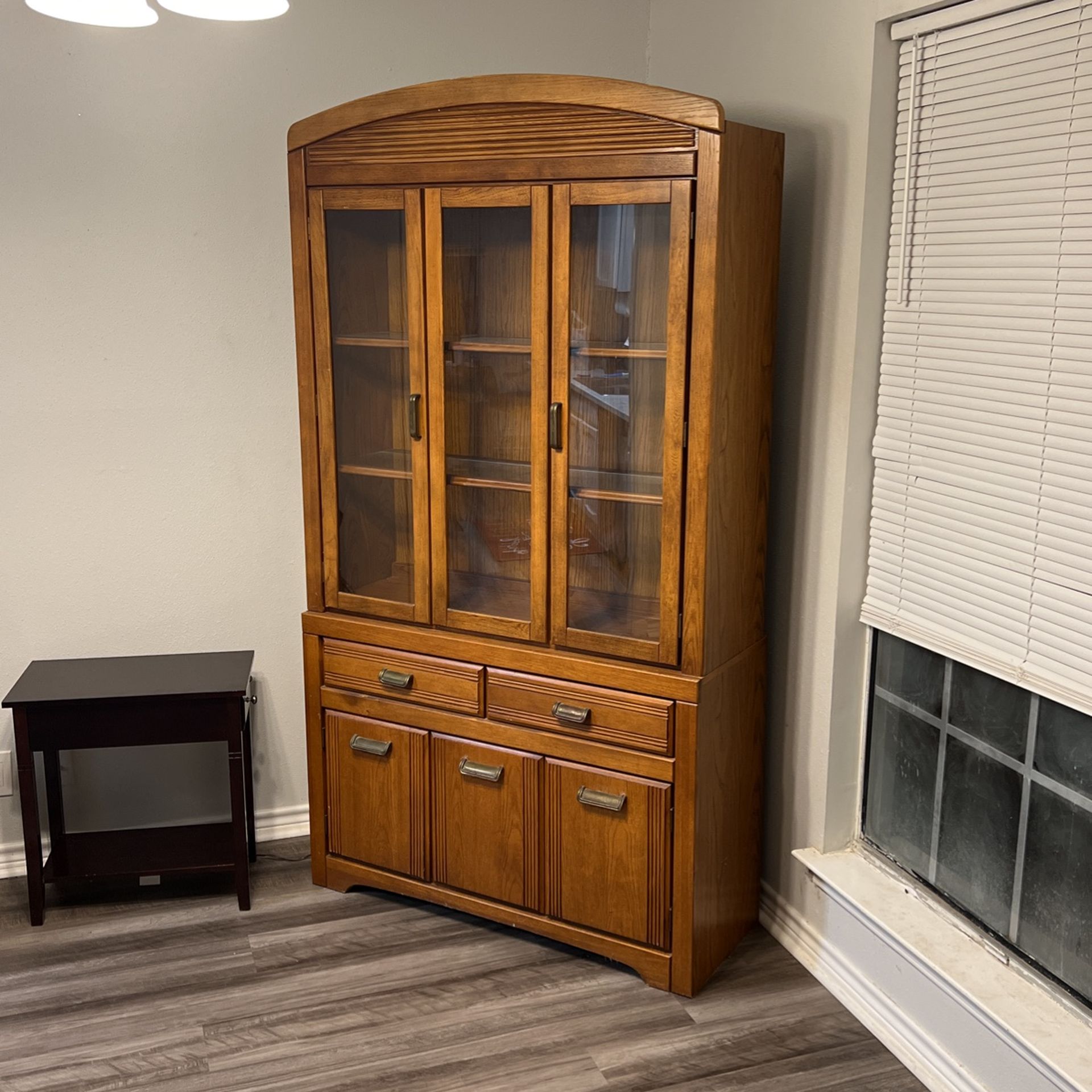 Oak wood cabinet with drawers, shelves, and cabinet doors