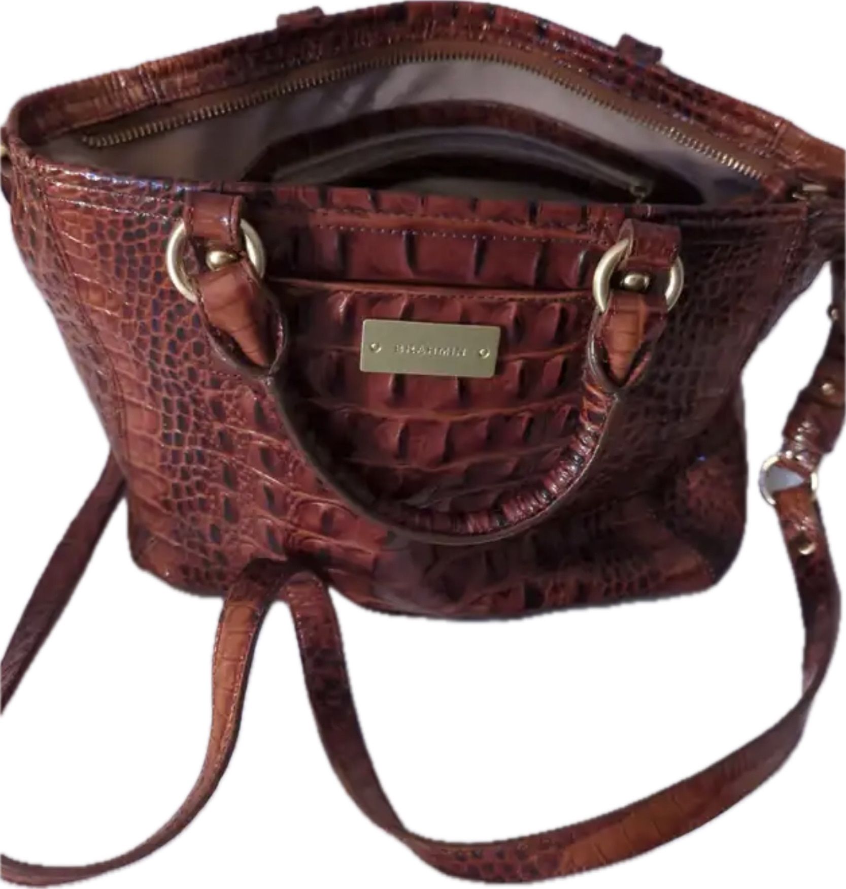 LIKE NEW** Brahmin Asher Crossover w/handles in the color Melbourne Pecan. Eye catching croc embossed leather with gold tone hardware. Excellent Like New condition - used once. - wish they had an ALMOST-new category. W Lx 8.5"H × 4.5”D Pickup in N. Seattle or Kirkland. Cash only