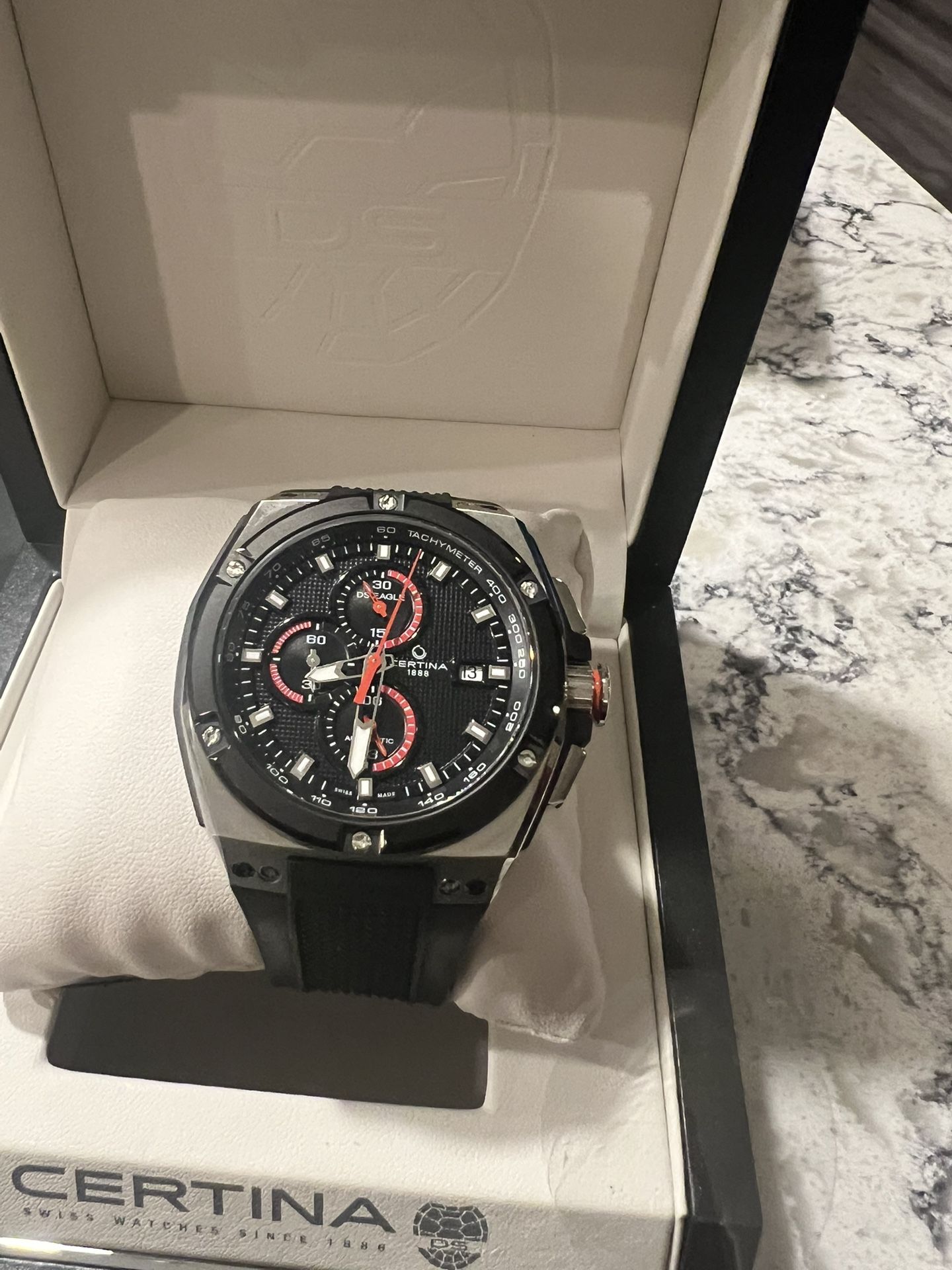 This beautiful elegant divers watch could be yours today. It has a Swiss precision automatic movement with a sweeping hand movement on the second hand and chronograph subdial. The case is 46 mm boasting a sporty black dial with red accent second dial and sub dials. The watch is meant to be enjoyed in the water; however, it could double for your every day casual look. This watch is water resistant at 200 meters with a double clasp water protection. It has a sapphire glass and stainless steel casing, giving it a sporty with an elegant look. The band is of a black rubber strap. The watch comes with its box and Manuel. The watch is new and never worn. . Chronograph 24 has this watch for $1800. I am asking for a reasonable price of $1200. I don’t want to negotiate due to the rarity and priced to sell. Let’s make it happen!