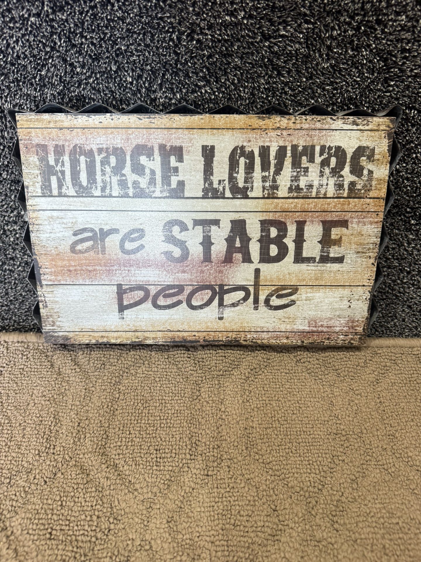 Amazing rustic horse lovers sign that says horse lovers are stable people heavy metal wrapped around the entire wooden sign. They’re unique. Measures approximately 12 x 9