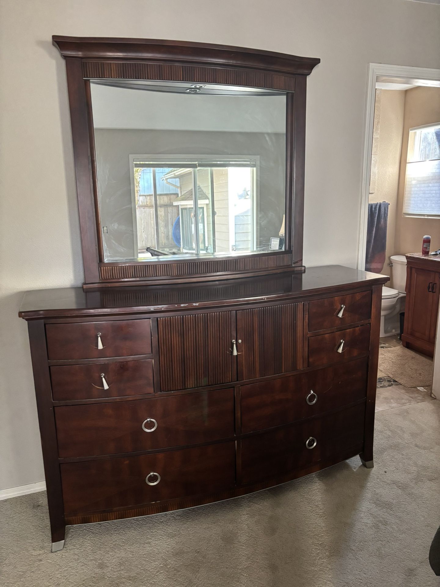 Dresser is 65x20x40 mirror is an additional 40”. 2 drawer chest is 42”x26”. One f the drawers needs fixed. Night stands are 26x26.