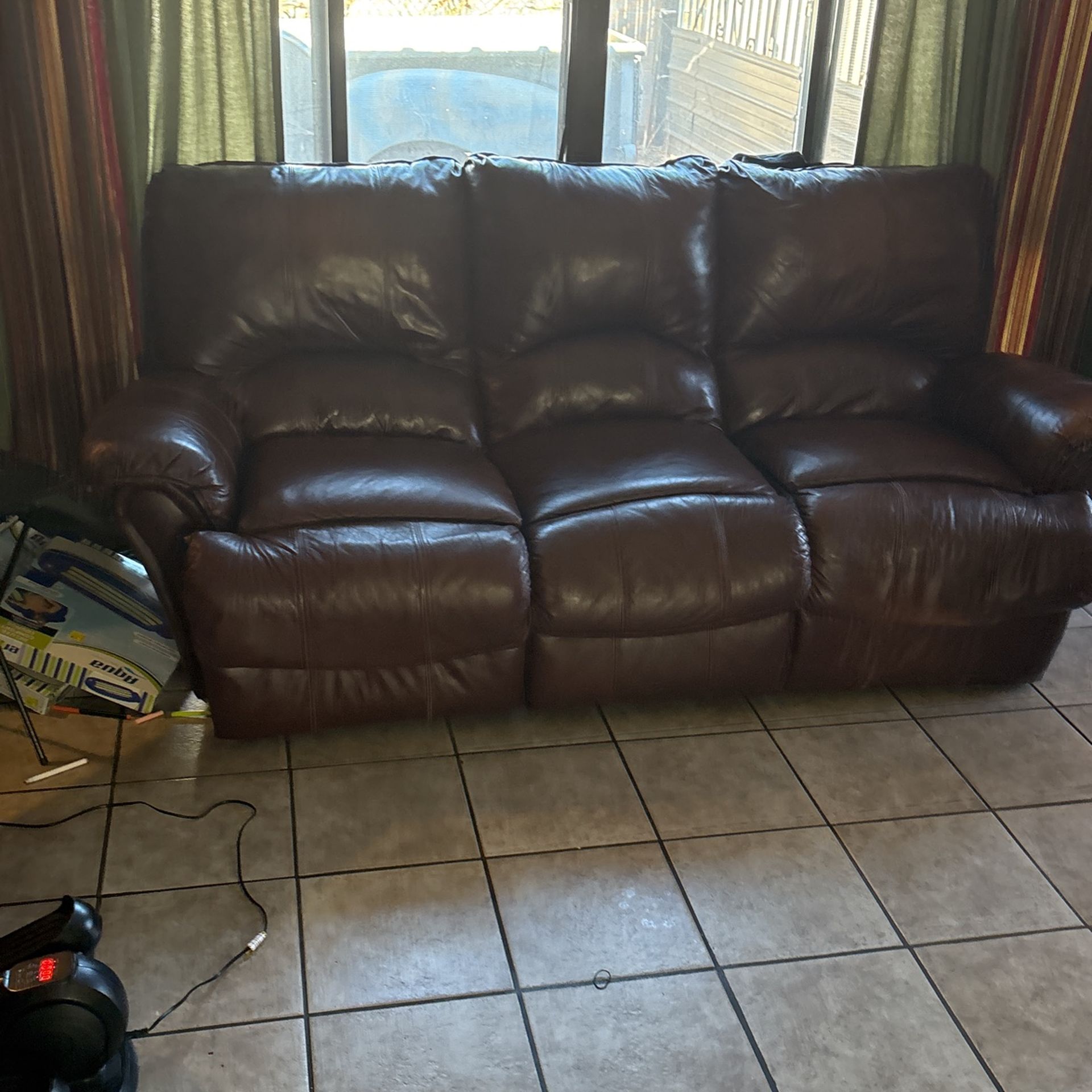 Three seat leather couch Dark brown Two seat recliner 8 feet wide Mid condition 100$ ObO