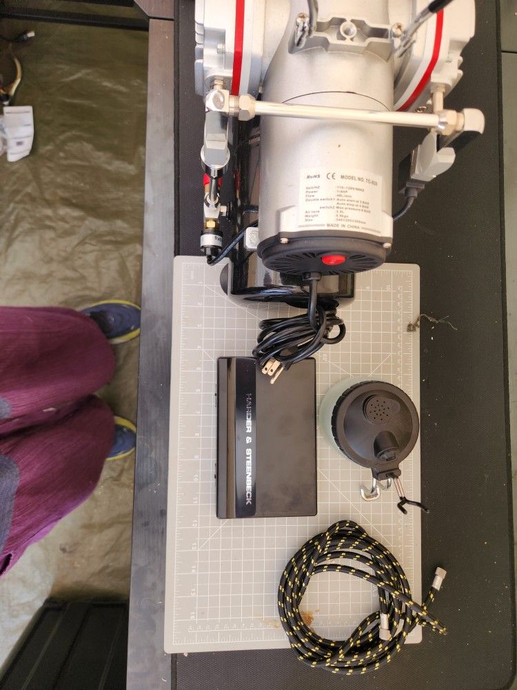 Fully new setup that I never got to use. Airbrush, electric vent with ducting, 1/4hp air compressor, air compressor hose, and paint pot/holder for airbrush.