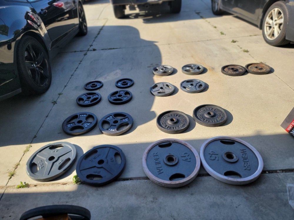 Lots Of Olympic Weights Available. 45s, 35s, 25s, 10s, 5s. $1 a poundVery Nice Dumbbells 40 And 30 Lb And Very Strong 7 Ft Olympic Barbell