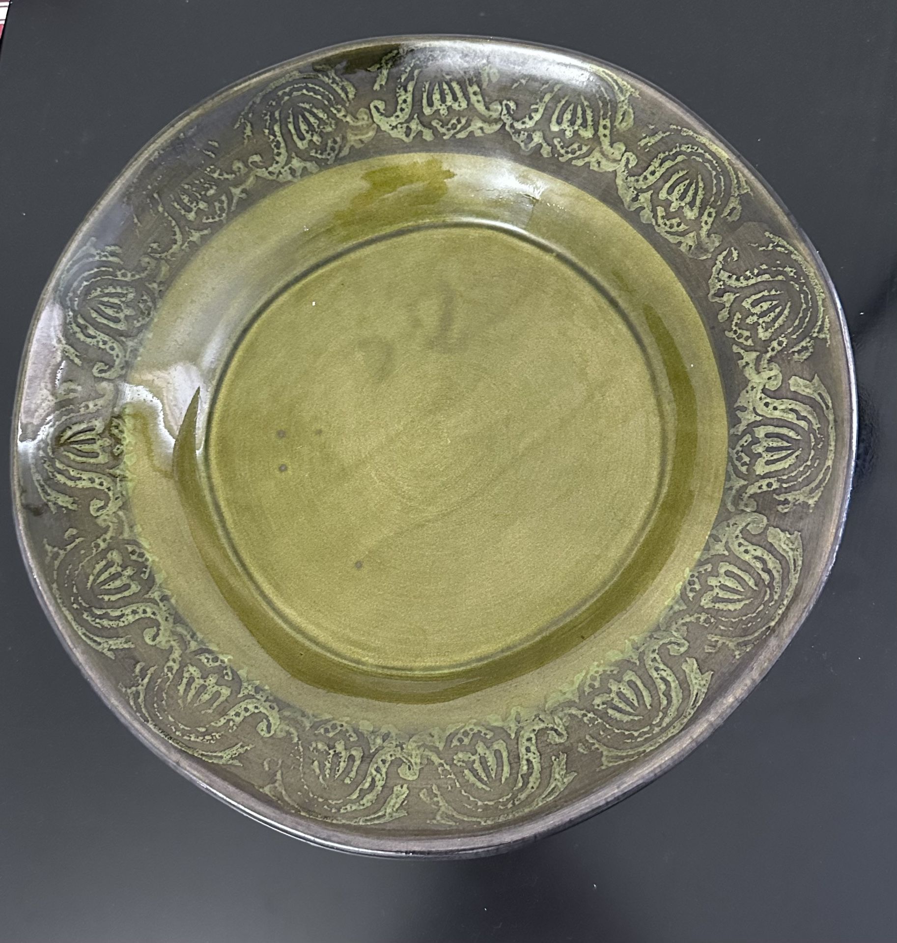 Nice piece! Italian hand-made/hand-painted vintage decorative ceramic plate Decorative olive-green glaze with repeating floral/leaf motif Dont know exact date but as per Chat GPT (1960s–1980s) good vintage decorative condition