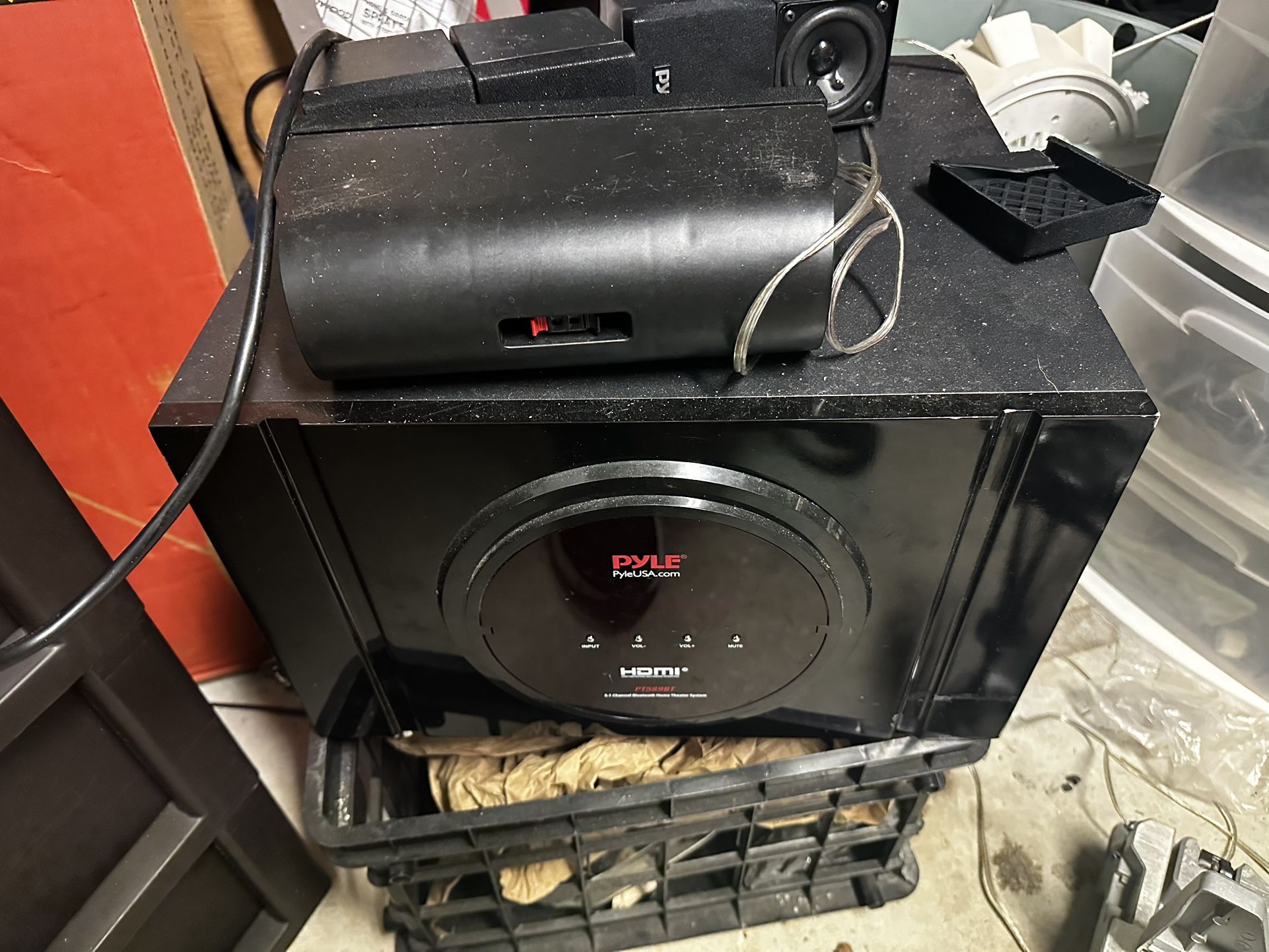Here we have a Pyle subwoofer surround sound system. Easy to set up and come with Bluetooth connectivity. Any questions please ask