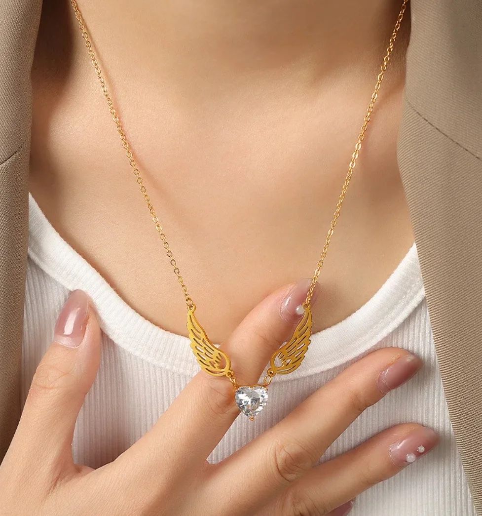 N253- Stainless Steel Gold Necklace Fashion Wings! LENGTH: 17 Inch +2 Inch MATERIAL: Stainless Steel COLOR : Gold STONE: Heart Crystal LIGHTWEIGHT NICKEL FREE WILL NOT TARNISH HYPO-ALLERGENIC Necklace Is Perfect To Wear Everyday And Add A Precious Touch To Your Daily Outfits. They Are Perfect To Wear Alone Or Stack Them With Other Jewelry.