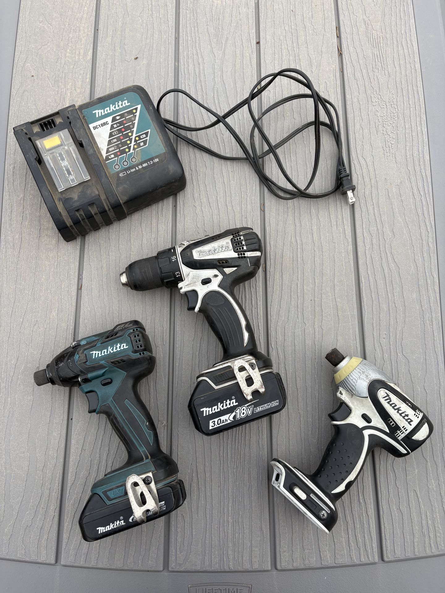 Makita drill and 2 impacts set with charger and batteries