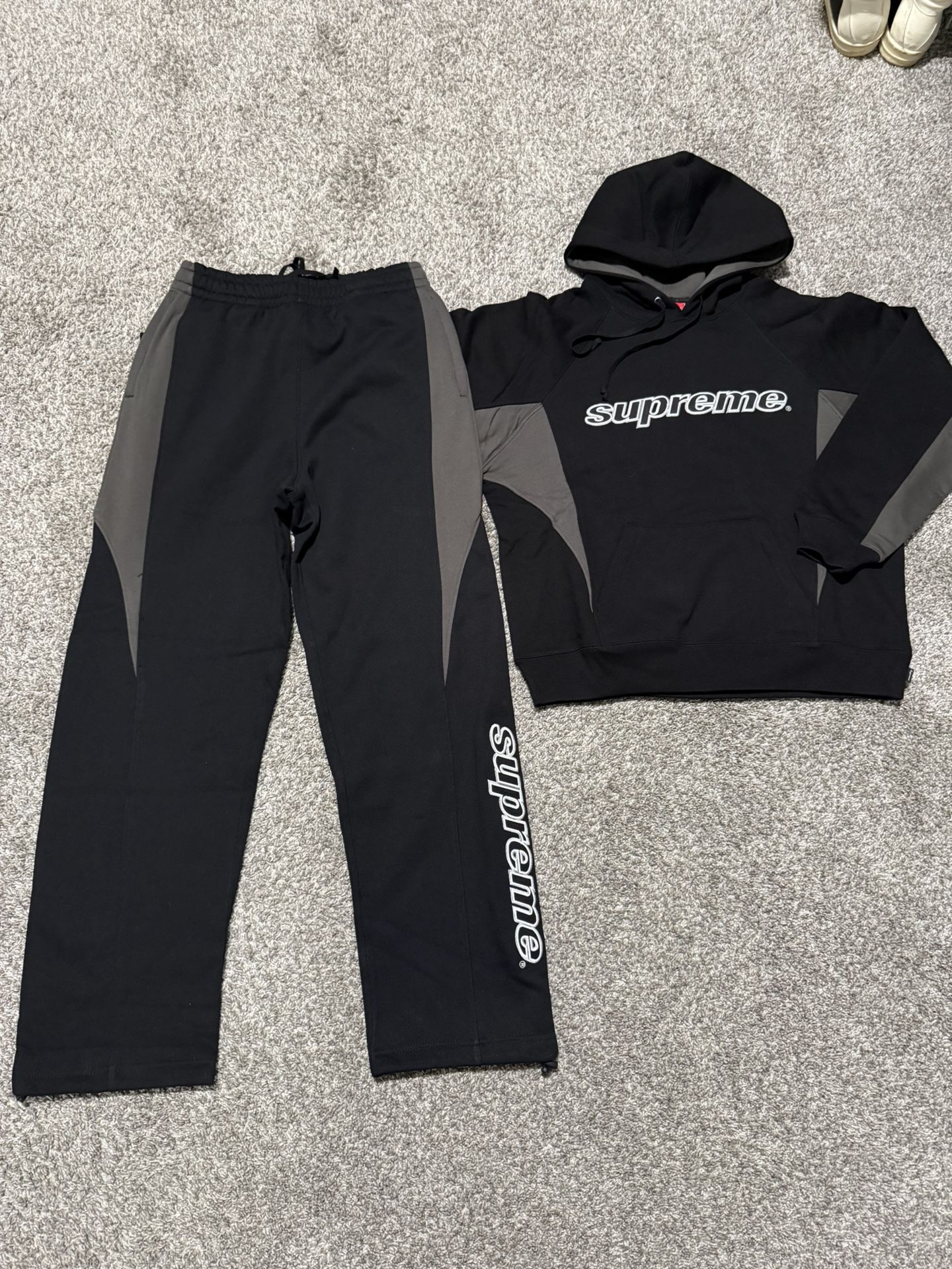 ~ DIVISION ONE SUPREME SET (SIZE S(Top M(Bottom)(condition: NEW) BOTTOM: 110 Top: 120 ~ Come w bag, papes, stickers ~ Any questions feel free to message me ~ MEETUPS/Local Delivery/Pickups available ~ Same/Next day quick shipping #supreme #streetwear #satinapplique #sweatpants #cuffed satin finish, applique design, black joggers, streetwear, oversized, comfy, logo print, minimalistic, casualwear, contemporary