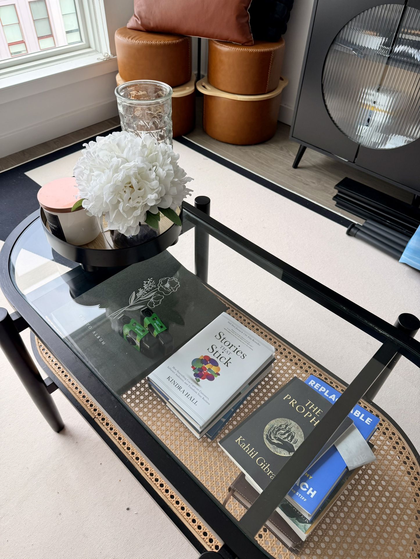 Oval glass top coffee table in black, perfect for small-medium sized spaces. Glass top is removable 36”L x 17”W x 17.5”H