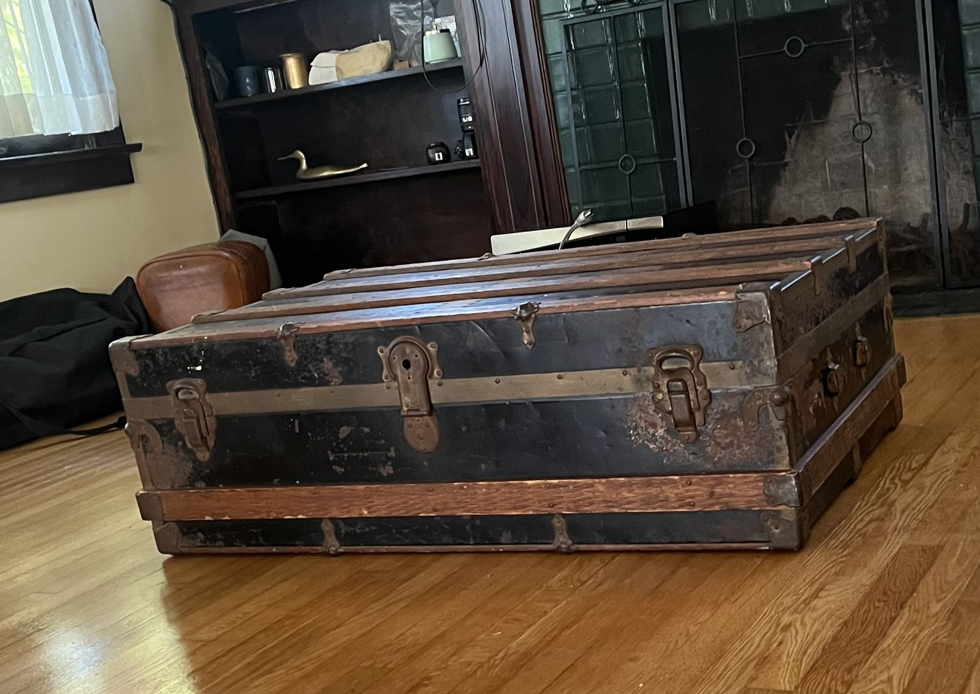 Old trunk… 40”x23”x13”, well made and sturdy. Middle latch can use replacement . It used as a coffee/console table. Pick up only.
