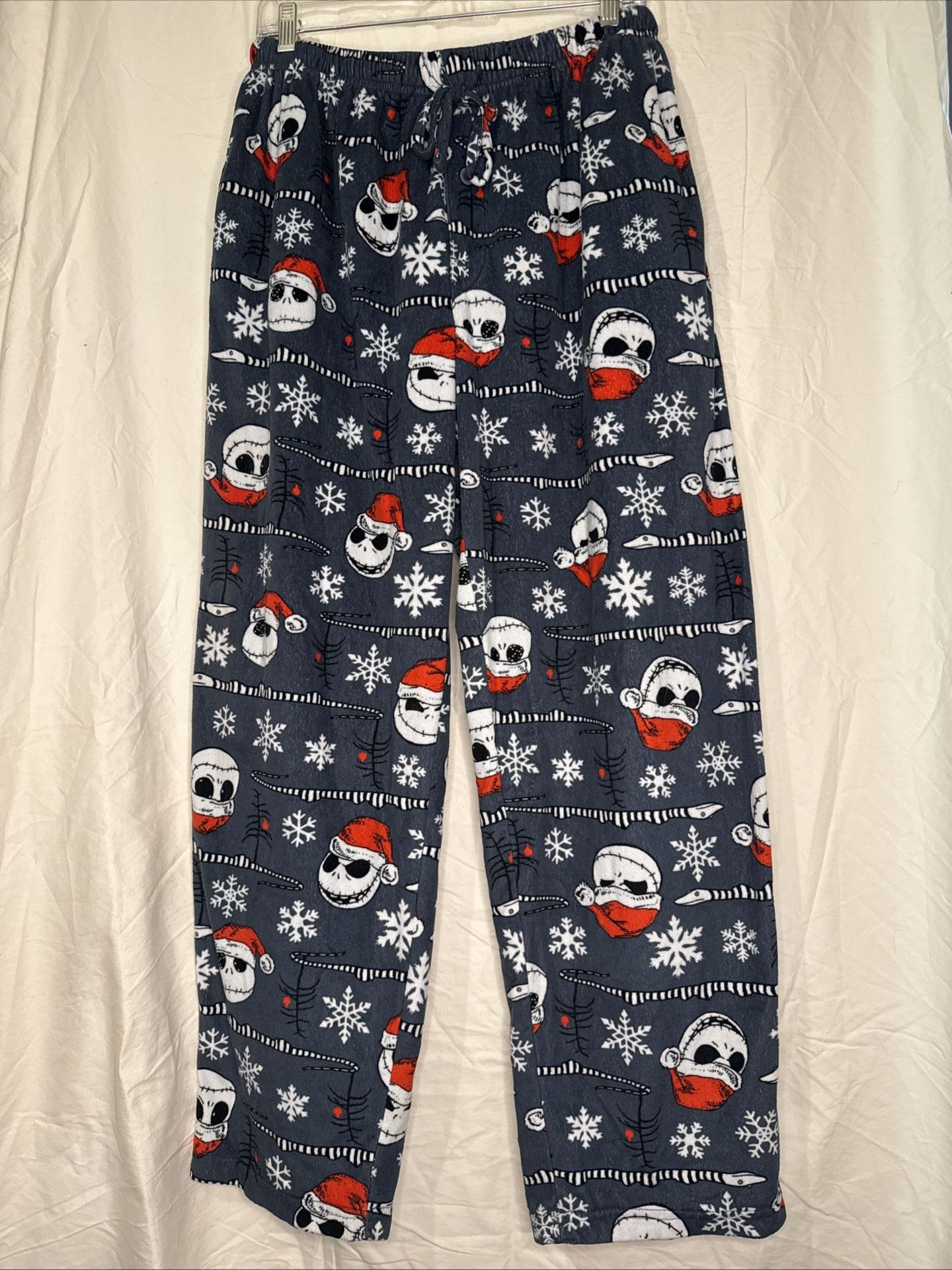 The Disney Jack The Night Before Christmas Pajama Pants in size Large feature a festive graphic print pattern with a drawstring closure for a comfortable fit and two side pockets. Made from cozy fleece polyester material, these pajama pants are machine washable and lightweight, perfect for the winter and fall seasons. The gray color with the Disney logo accents adds a touch of holiday cheer to this unisex adult-themed garment, making it a fun and cozy choice for celebrating Christmas.