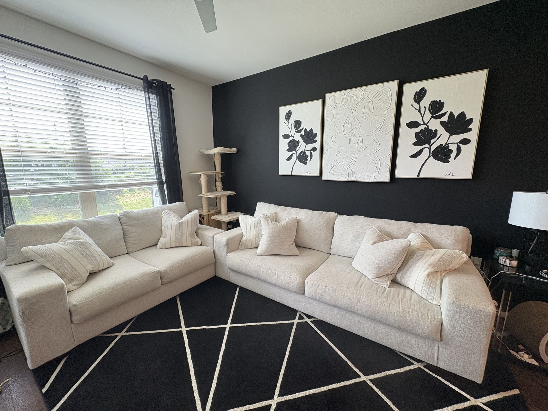 Couch and Loveseat. Couch is 8’ long, 3’5” deep. Loveseat is 5’10” long, 3’5” deep. Purchased for $1,650 at Ashley Furniture. Loveseat has some damage from cat scratching, pictures added. Willing to negotiate pricing due to this. Both couches are in great condition otherwise! ** Will sell with 8x10 rug for an extra $40. Will sell with rug and all 3 pictures for an extra $75. **