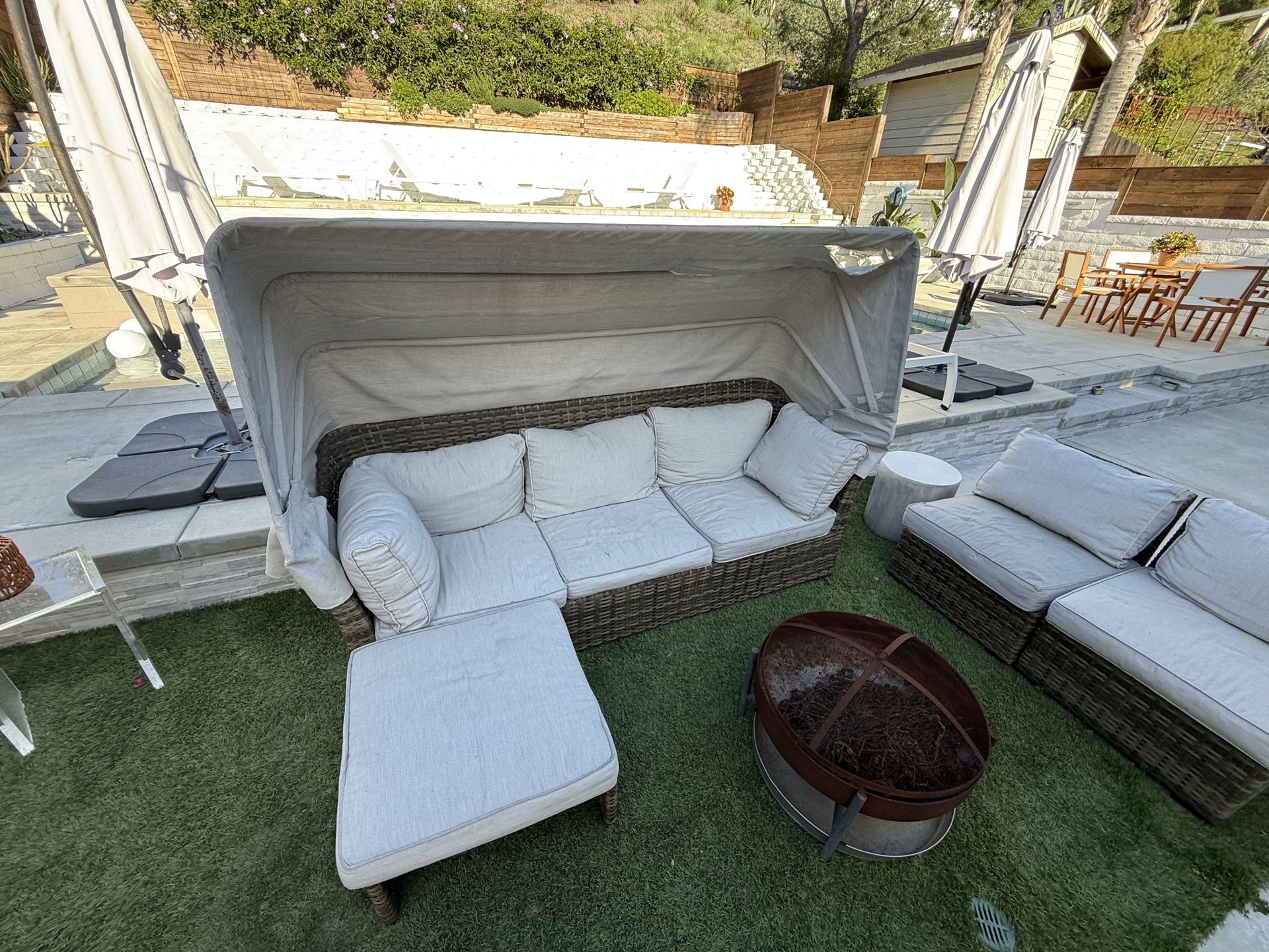 Used outdoor day bed. Please see photos for details on condition. 86W x 63D x 33H Fire Pit also for sale Please bring help and vehicle large enough to move this furniture.