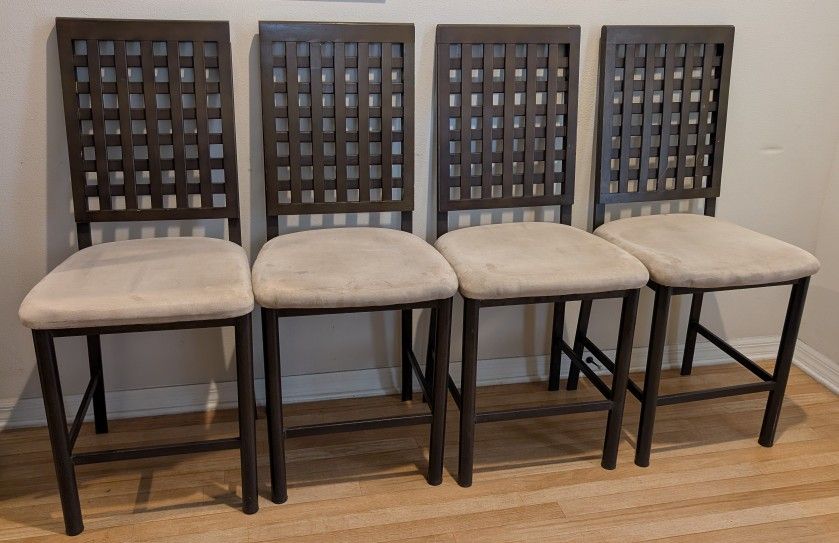 These four chairs have wood lattice designed backs on a metal frame and tan fabric seats. They show some wear, but could be recovered for a change, and they are sturdy. They are each 44 inches high, 19 inches wide and 18 inches deep. The seats are 23 inches high.