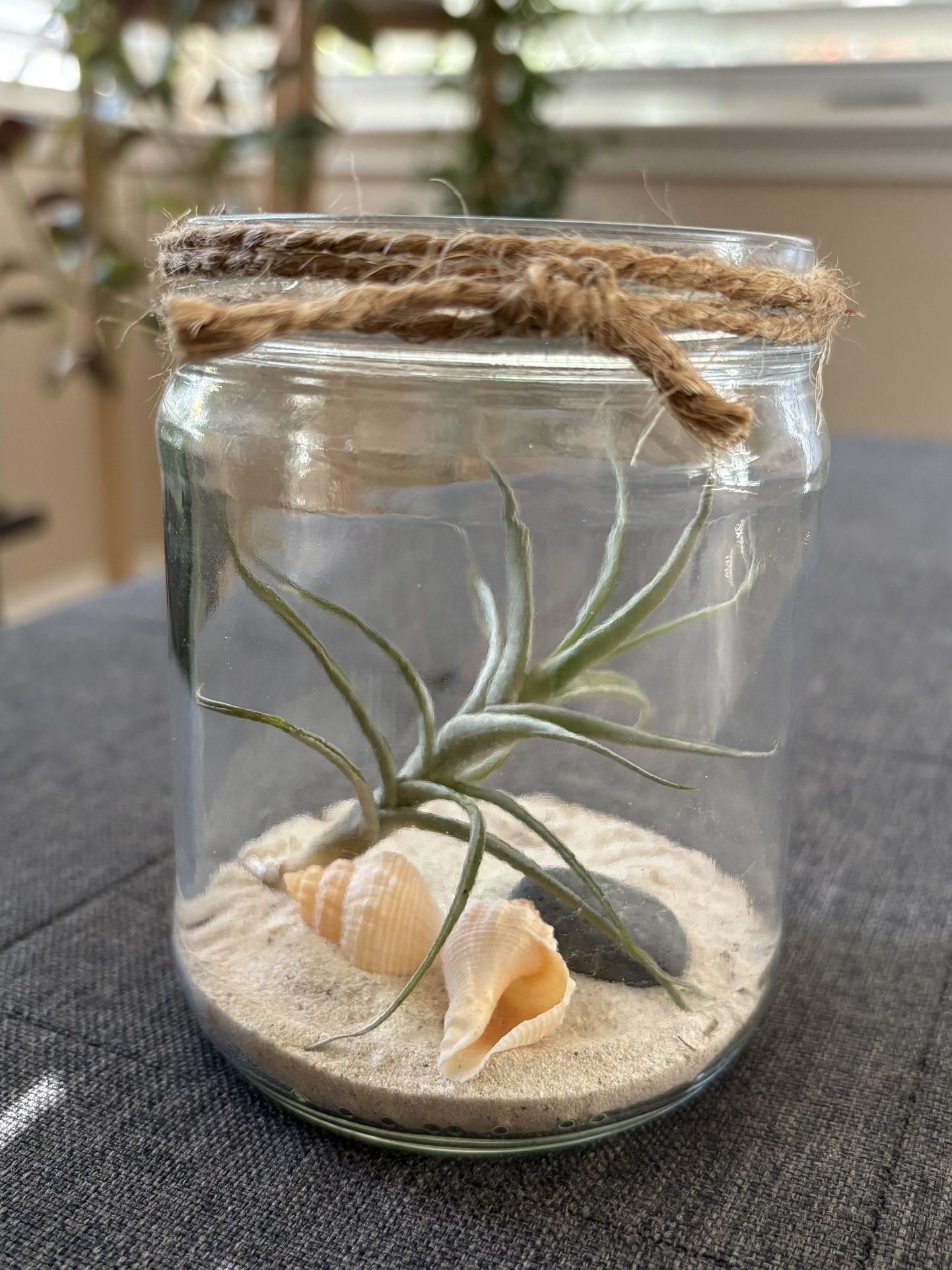 Live air plant displayed in glass jar with sand, stone, and shells. Snake plant or air plant. $5/each.