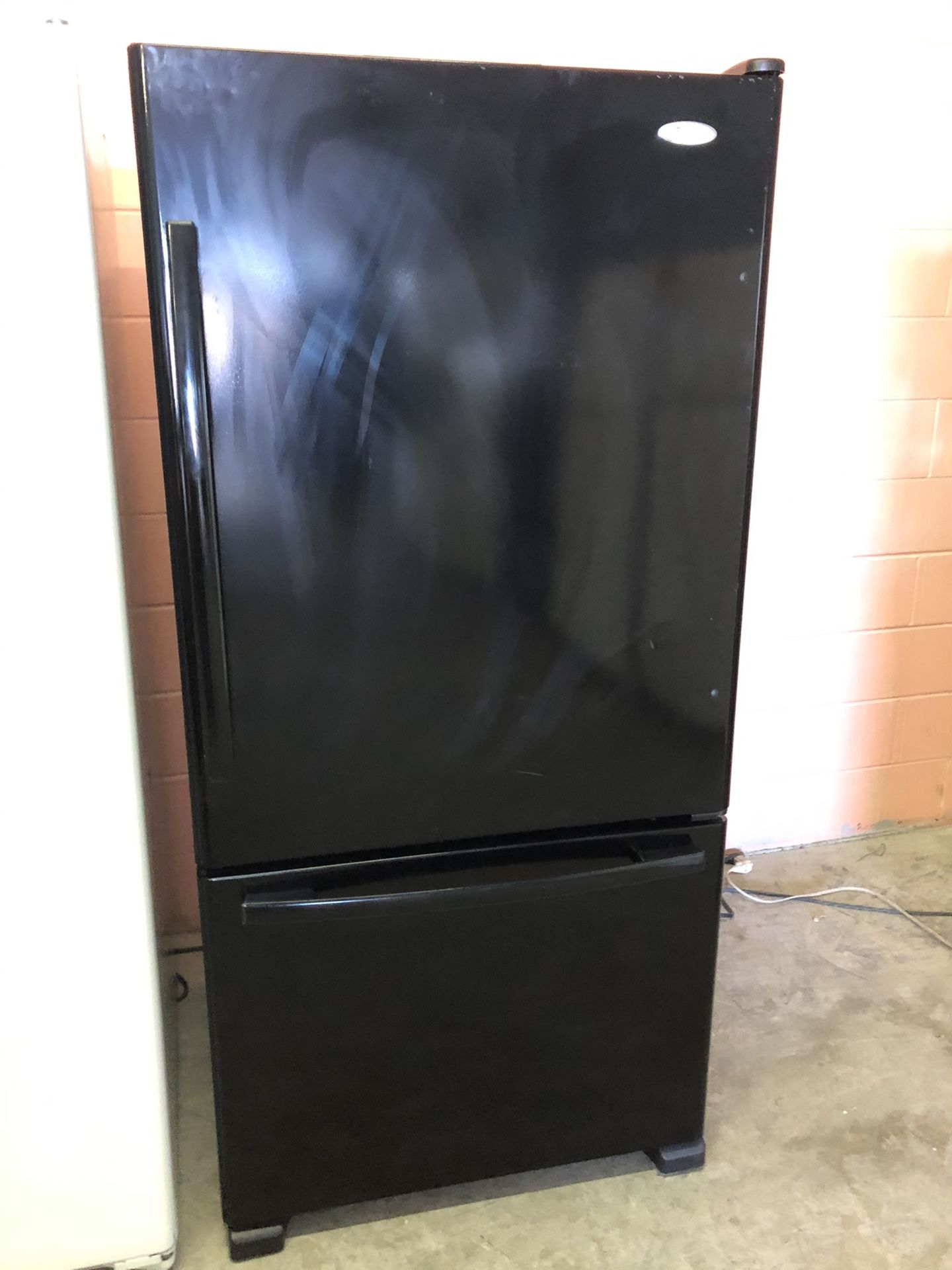 Whirlpool black 22 cubic foot bottom freezer refrigerator with ice maker. Food section has adjustable split spill proof glass shelves deli draw 2 humidity controlled crispers and adjustable door bins. Freezer is a pull out draw with ice maker and 2 fully extendable baskets. Refrigerator is plugged in and running. Comes with 120 day warranty. Financing and delivery available.