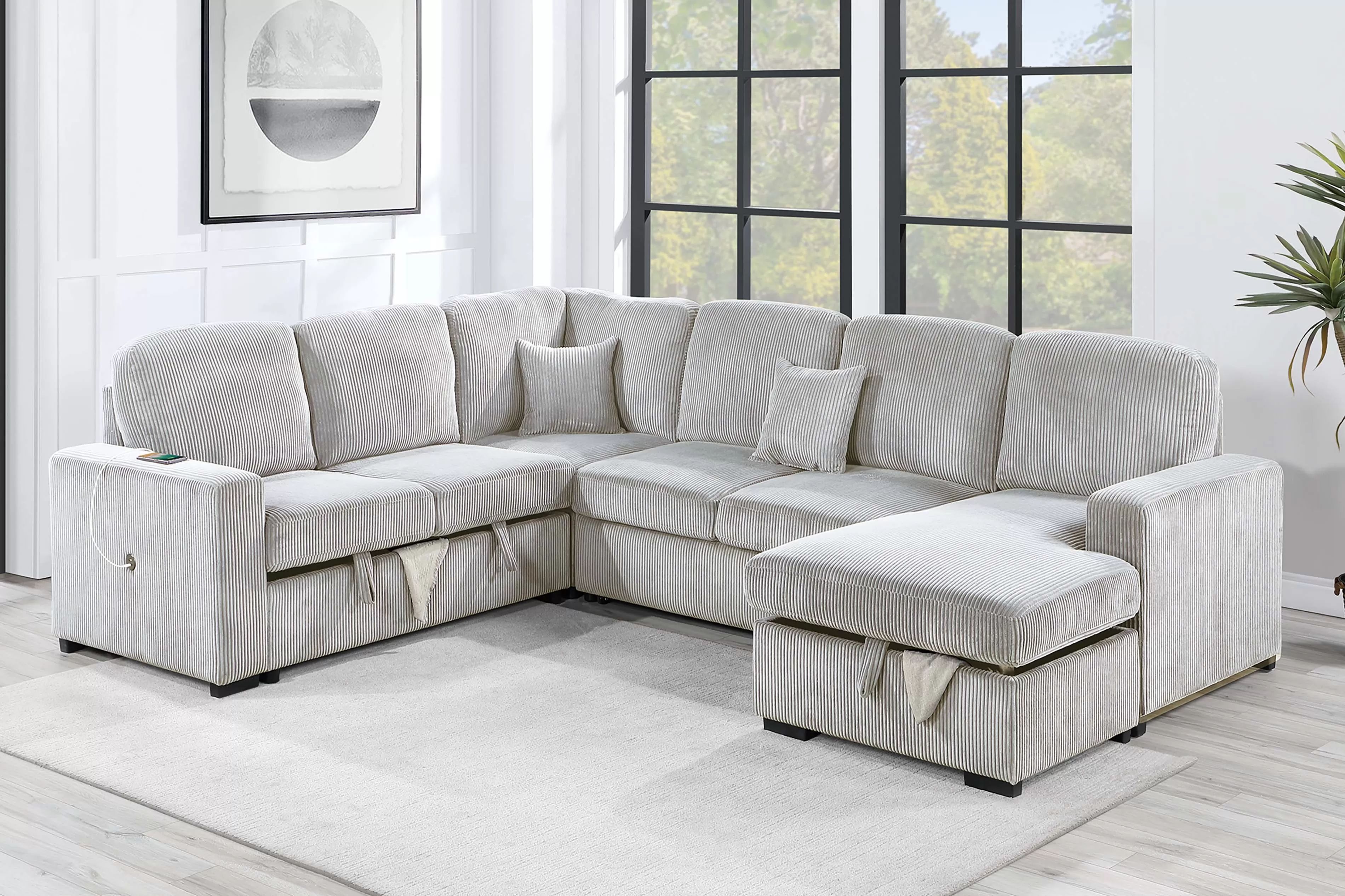 Brand new in a box delivered directly from the manufacturer. NO SHOWROOM Delivery Available Pay CASH, Zelle, Or Apple Pay at delivery. Sleeper Sofa, Chaise Storage, Sofa Storage & USB Port Color: Ivory Material: Corduroy
