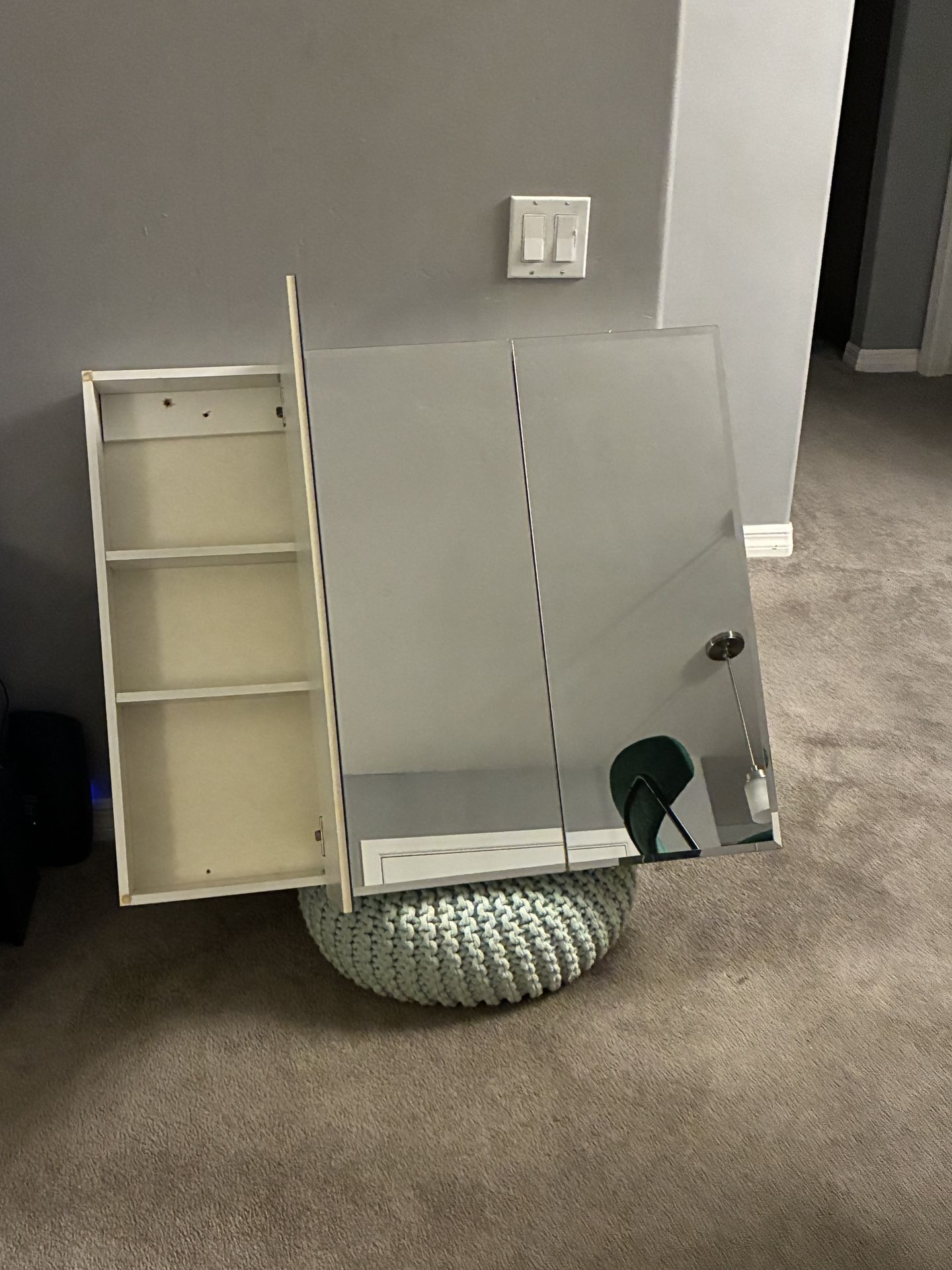 3-Piece Mirror with Storage – Wall-Mounted Cabinet Clean, modern 3-panel mirror with built-in storage—perfect for a bathroom, bedroom, or entryway. Wall screws included 36” W x 29 3/4” H x 4 1/4” D Good overall condition with a few scratches in non-visible areas from taking it down from the wall. I can deliver around San Diego or North County for extra $20